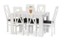 Jídelní sestava Valdo 6 se skládá ze stolu a šesti židlí. Tato jídelní sestava splní svůj účel na výbornou nejen v kuchyni, ale i v jídelně, nebo obývacím pokoji s jídelním koutem. Svou vysokou kvalitou a precizním zpracováním, uspokojí všechny budoucí, i ty velmi náročné, uživatele. Stůl je vyrobený z bílého matného lamina tl.22 mm, kostry židlí z bukového dřeva, barveného na bílou barvu. Jídelní sestava je dodávaná v demontu. Součástí balení je schématický montážní návod, včetně všech potřebných spojovacích prvků. Cena je uvedena za jídelní stůl a 6 židlí. Úvodní fotografie je ilustrační. Židle budou dodány v modré barvě.