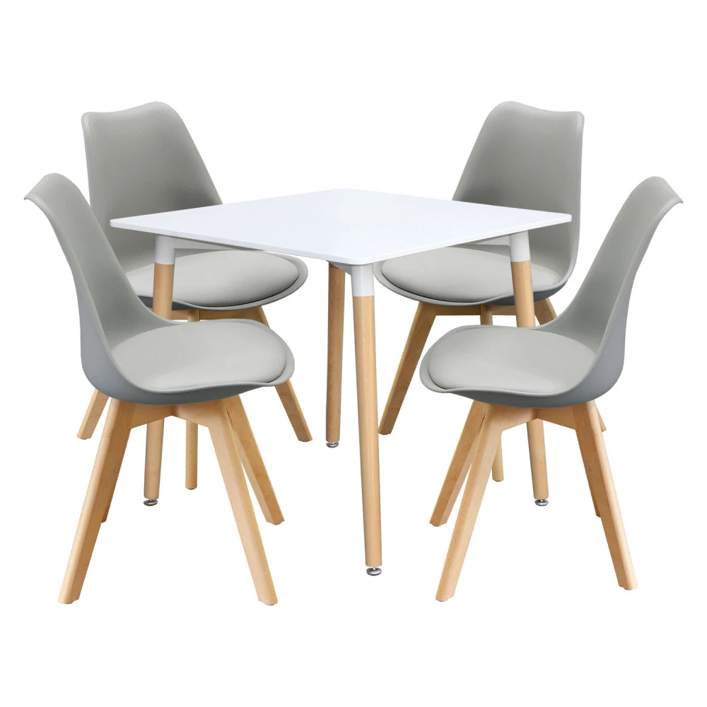 jídelní stůl 3150 a 4 jídelní židle 3149 deska MDF, barevné provedení bílá rozměr stolu (š/h/v): 80 × 80 × 74 cmkovová konstrukce, barevné provedení bílá kulaté nohy, materiál masiv buk nastavitelné plastové kluzáky s pochromovanou krytkou korpus PP, sedák kůže – imitace, barevné provedení šedá nohy masiv buk, výška sedu 46 cm rozměr židle (š/h/v): 49 × 54 × 83 cm