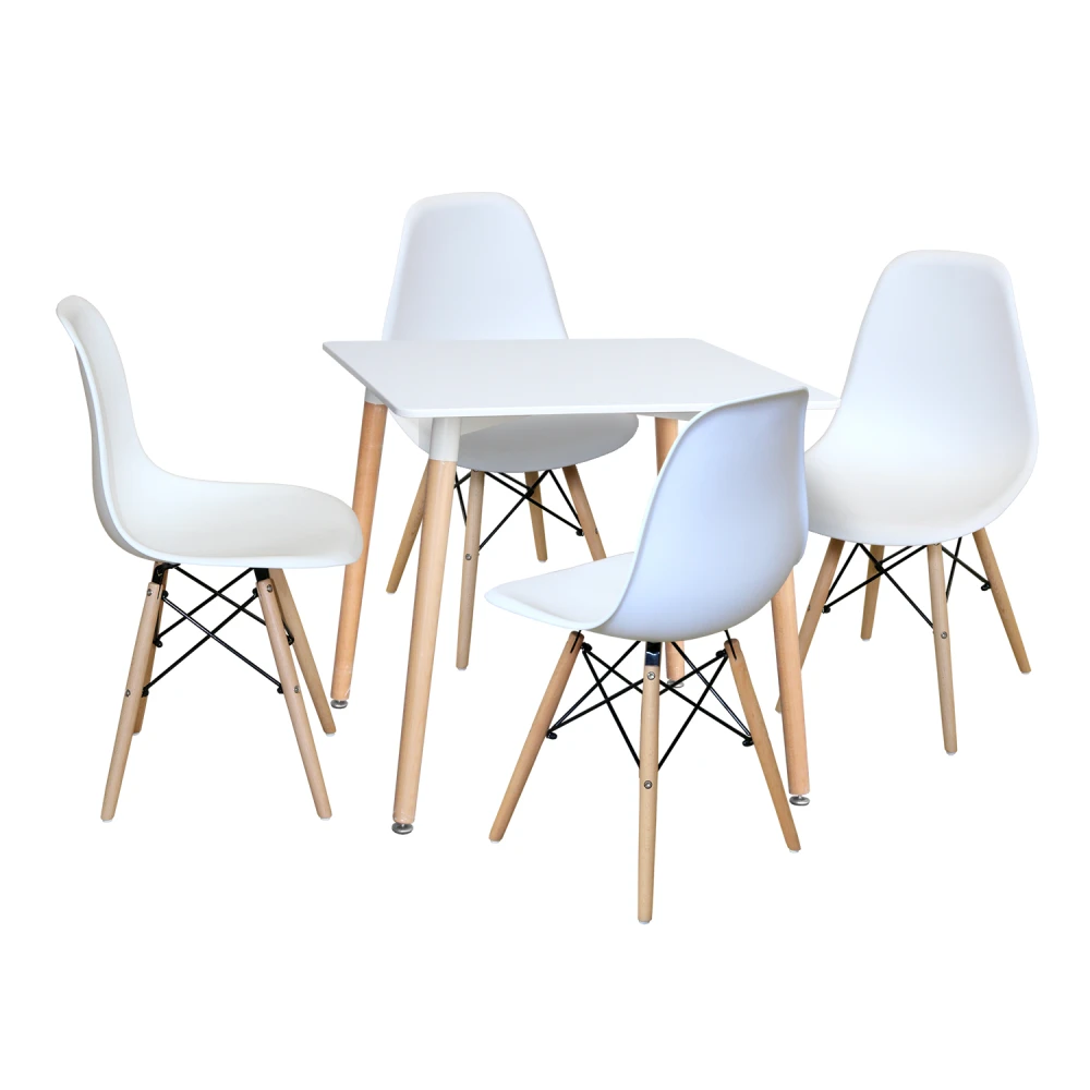 jídelní stůl UNO 3150 a 4 jídelní židle UNO 3141 stůl: deska MDF, barevné provedení bílá kovová konstrukce, barevné provedení bílá kulaté nohy, materiál masiv buk nastavitelné plastové kluzáky s pochromovanou krytkou židle: materiál sedačky PP, barevné provedení bílá kovová konstrukce, nohy materiál masiv buk výška sedu židle 46 cm rozměr stolu (š/h/v) 80 × 80 × 74 cm rozměr židle (š/h/v) 46 × 51 × 84 cm