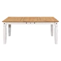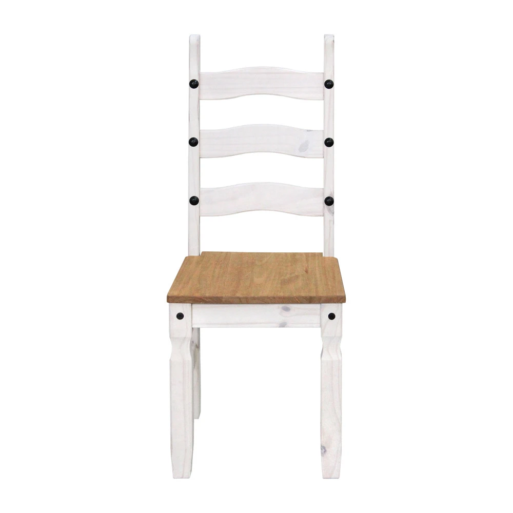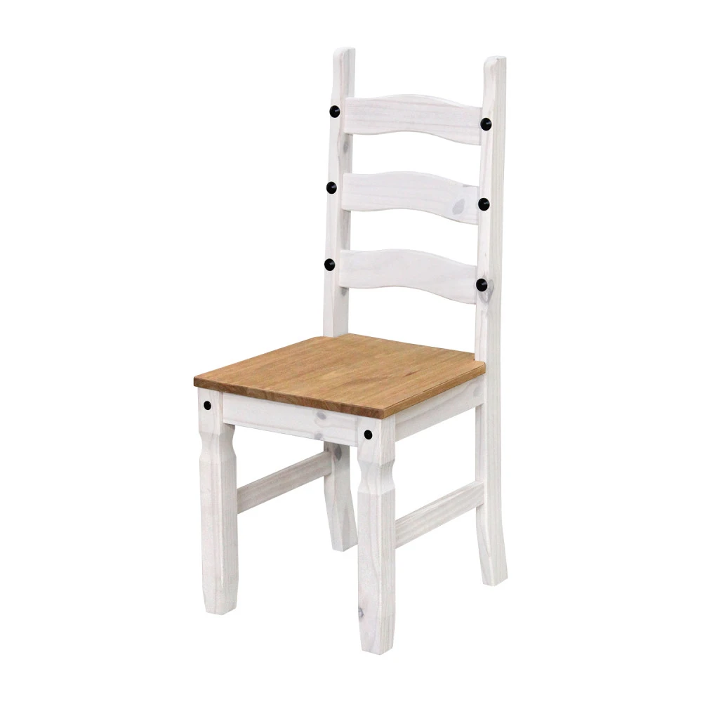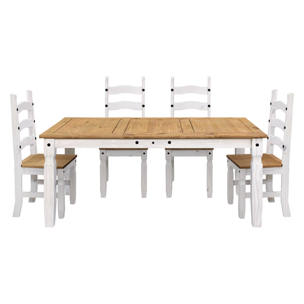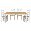 jídelní stůl 16110B a 4 jídelní židle 160204B materiál masiv borovice voskovaná v bílém odstínu horní deska stolu i židle masiv borovice voskovaná v medovém odstínu výška sedu židle 46 cm rozměr stolu (š/h/v): 92 × 178 × 76 cm, rozměr židle (š/h/v): 45 × 50 × 107 cm součást sestavy Corona bílá