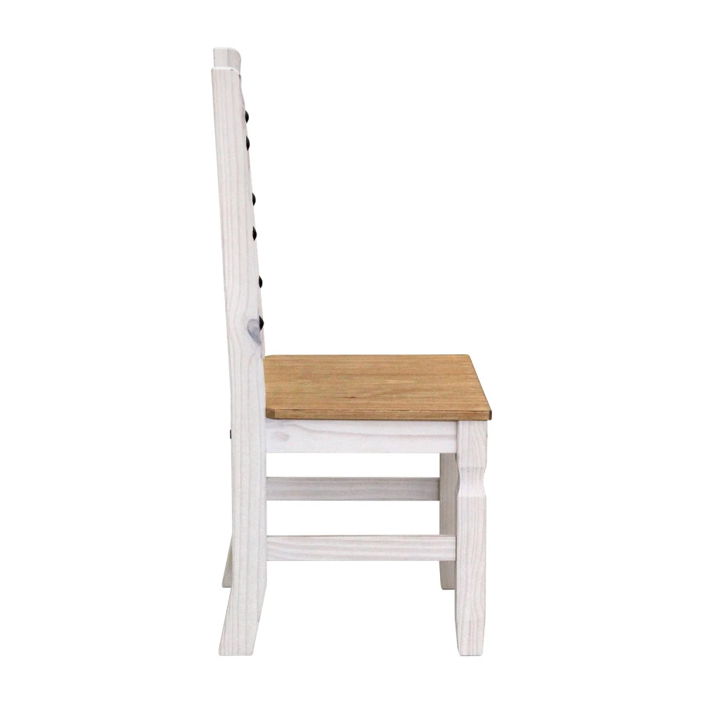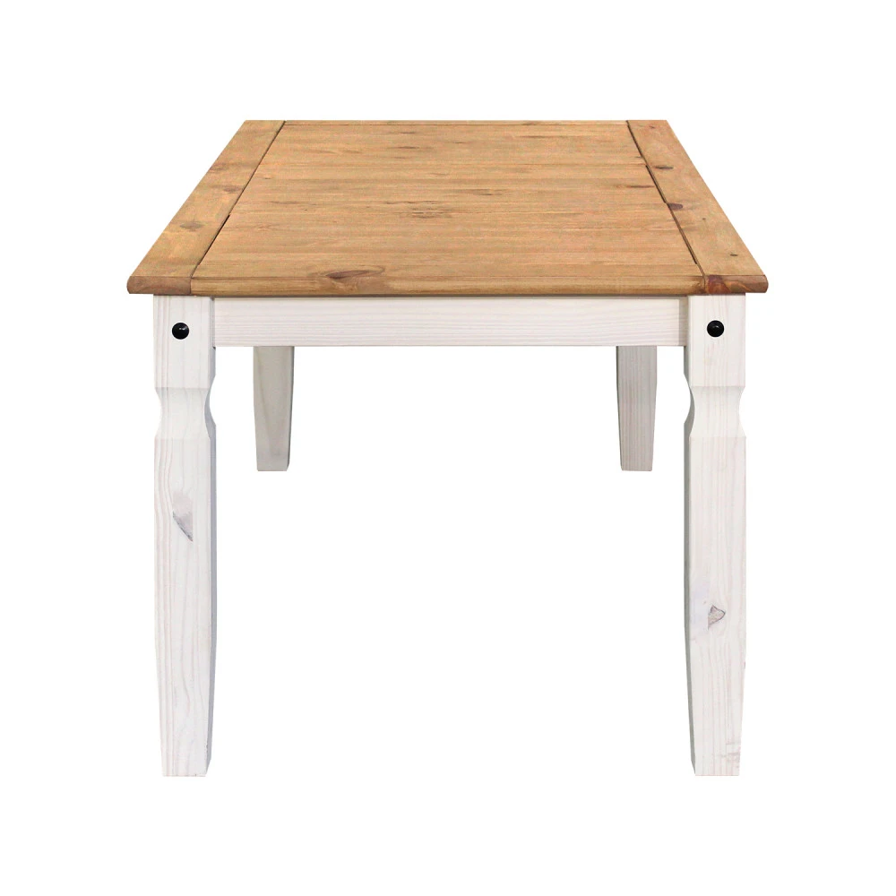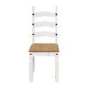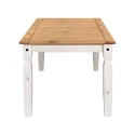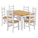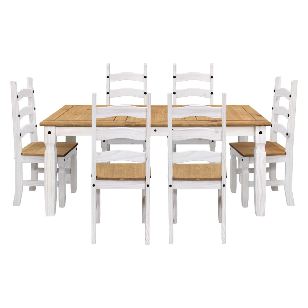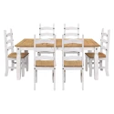 jídelní stůl 16110B a 6 jídelních židlí 160204B materiál masiv borovice voskovaná v bílém odstínu horní deska stolu i židle masiv borovice voskovaná v medovém odstínu výška sedu židle 46 cm rozměr stolu (š/h/v): 92 × 178 × 76 cm, rozměr židle (š/h/v): 45 × 50 × 107 cm součást sestavy Corona bílá