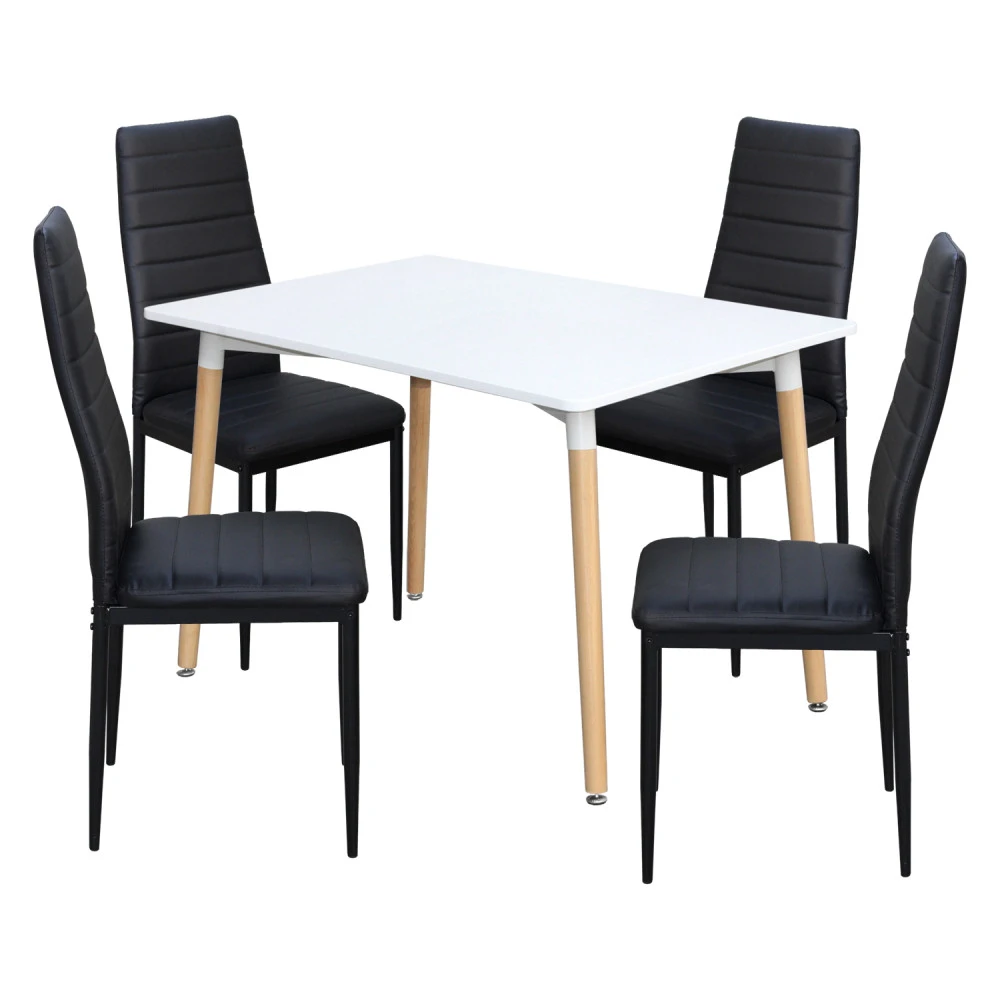 jídelní stůl ONE 3151 a 4 jídelní židle SIGMA 3166 stůl: deska MDF, barevné provedení bílá kovová konstrukce, barevné provedení bílá kulaté nohy, materiál masiv buk židle: potah kůže – imitace, barevné provedení černá kovové nohy a konstrukce, výška sedu židle 47 cm rozměr stolu (š/h/v) 120 × 80 × 74 cm rozměr židle (š/h/v) 42 × 41 × 98 cm