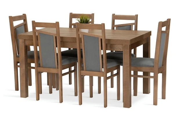 Jídelní sestava Magnum 6 se skládá z rozkládacího stolu a šesti židlí. Tato jídelní sestava splní svůj účel na výbornou nejen v kuchyni, ale i v jídelně, nebo obývacím pokoji s jídelním koutem. Svou vysokou kvalitou a precizním zpracováním, uspokojí všechny budoucí, i ty velmi náročné, uživatele. Nohy stolu a kostry židlí jsou vyrobeny z bukového dřeva, mořeného tak, aby ladily s deskou stolu, která je vyrobená z lamina v dekoru dub lefkas. Jídelní sestava je dodávaná v demontu. Součástí balení je schématický montážní návod, včetně všech potřebných spojovacích prvků. Cena je uvedena za jídelní stůl a 6 židlí.