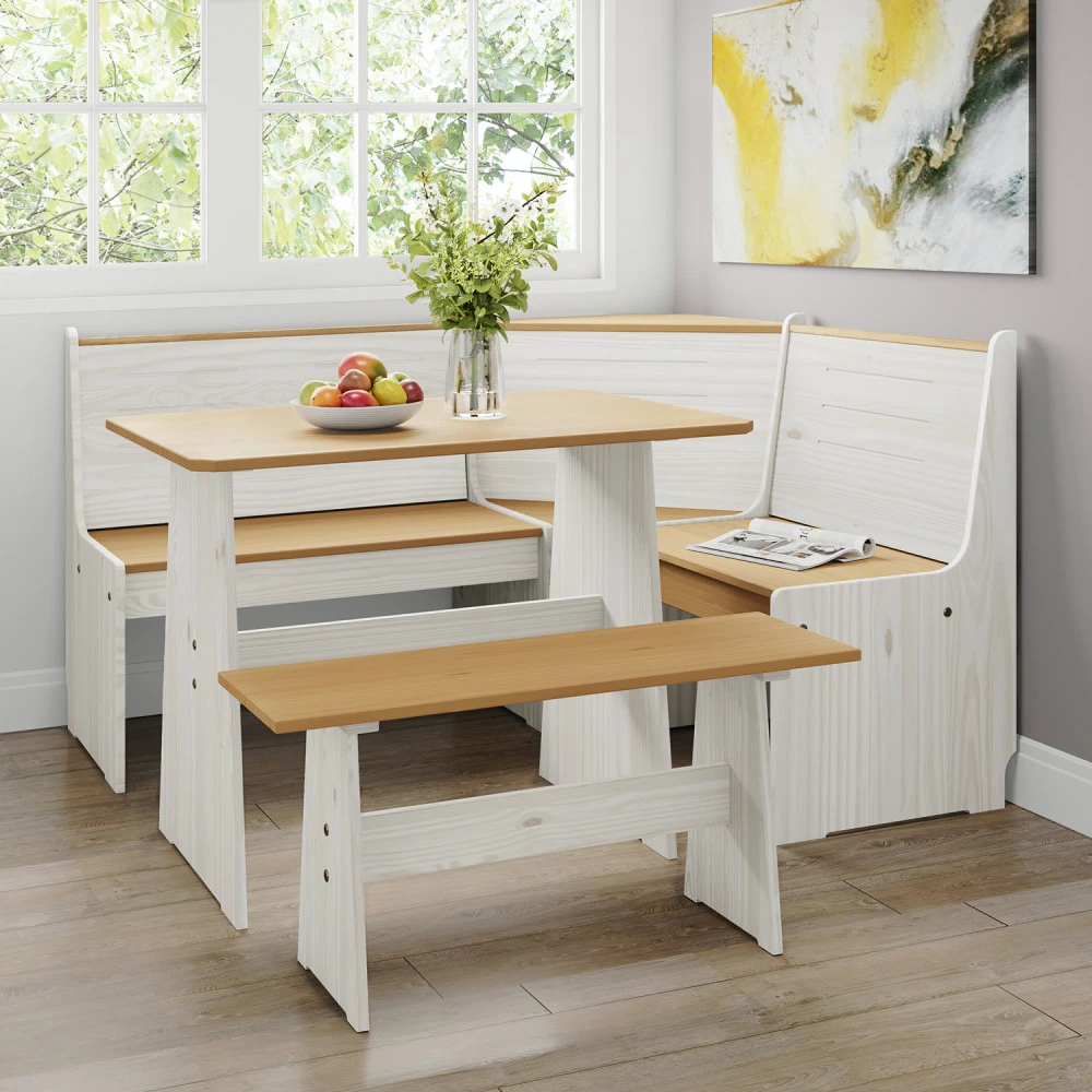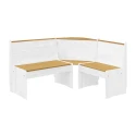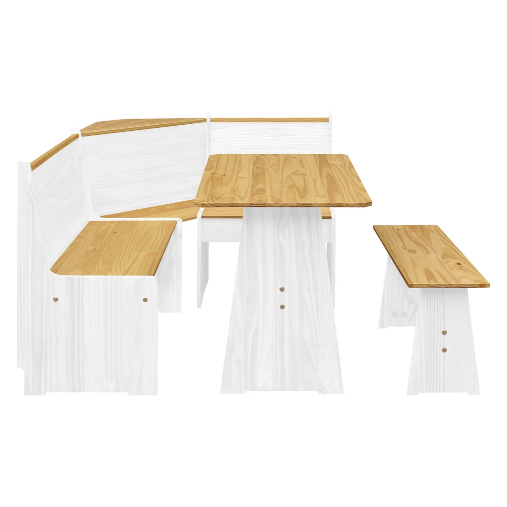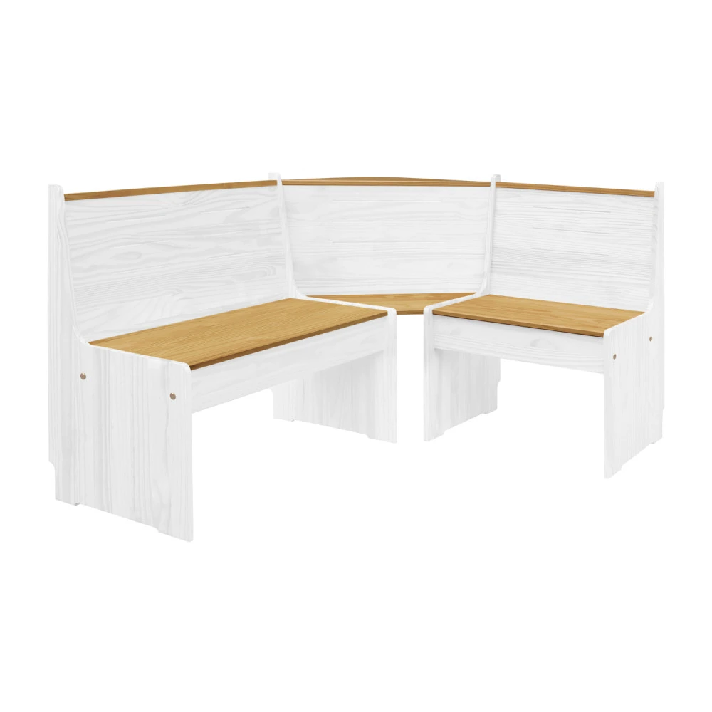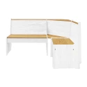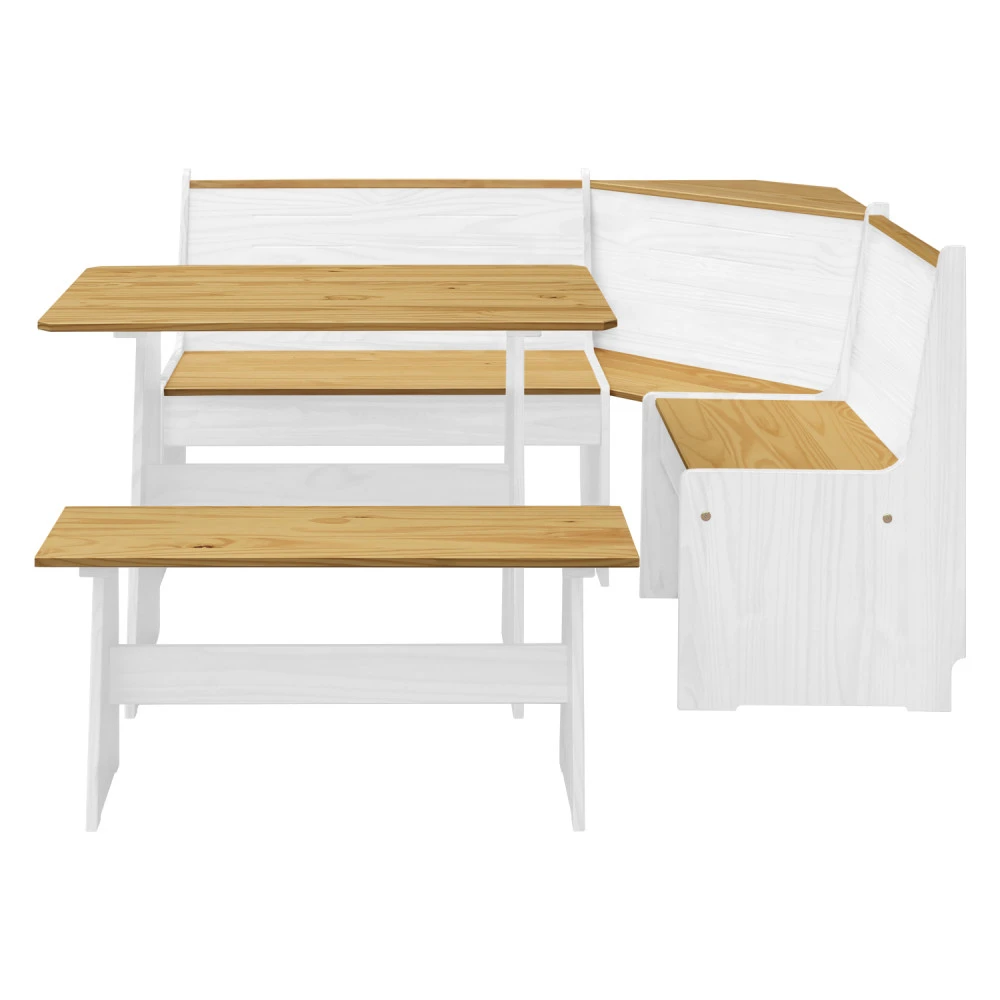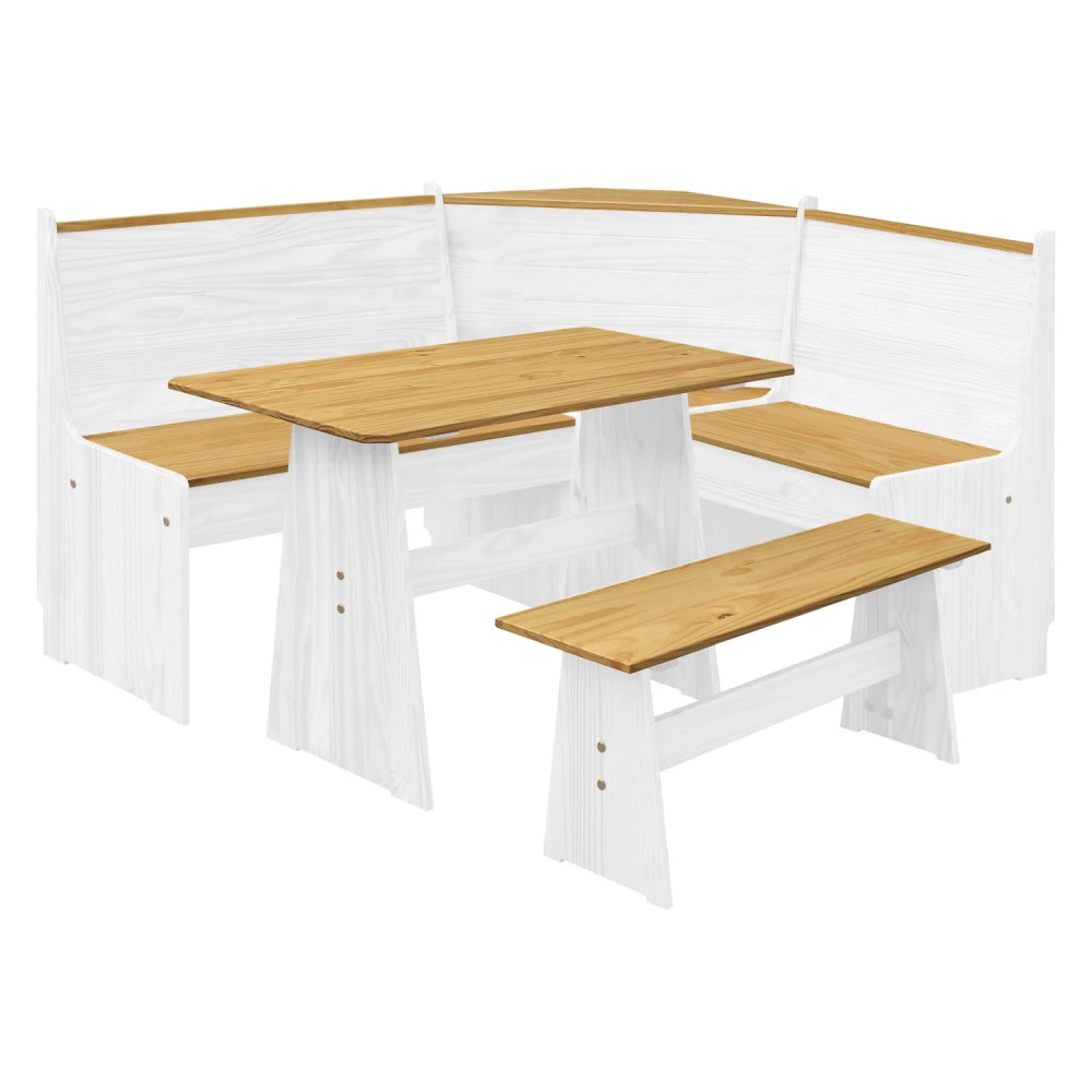 materiál masiv borovice, barevné provedení bílý / medový lak rohová lavice, stůl a lavice rozměr rohové lavice (š/h/v) 152/119 × 51 × 86 cm, výška sedu 43 cm hloubka sedu 39 cm, šířka sedu 91,5 cm širší část, 58,5 cm užší část rozměr stolu (š/h/v) 100 × 60 × 73 cm, rozměr lavice (š/h/v) 92 × 28 × 43 cm možnost sestavení na levou i pravou stranu