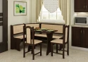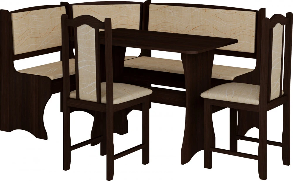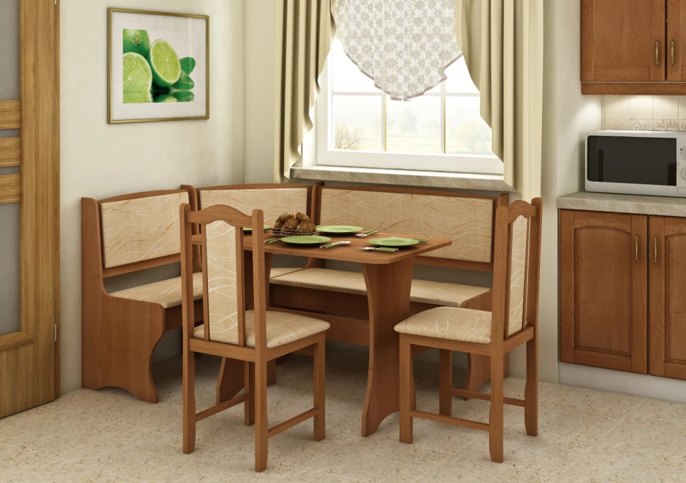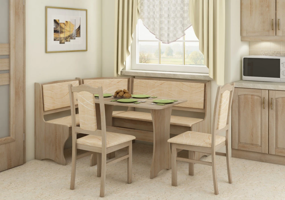 Jídelní set je složený z rohové lavice, stolu a dvou židlí, je oblíbený díky svým rozměrům a praktickému využití. Sestava je vyrobena z 16 mm LTD, na výběr z několika barevných variant. Použité čalounění je tkanina Monaco. Dodáno v demontu. Lavice je univerzální, lze smontovat napravo i nalevo dle umístění v interiéru a obsahuje malý úložný prostor.