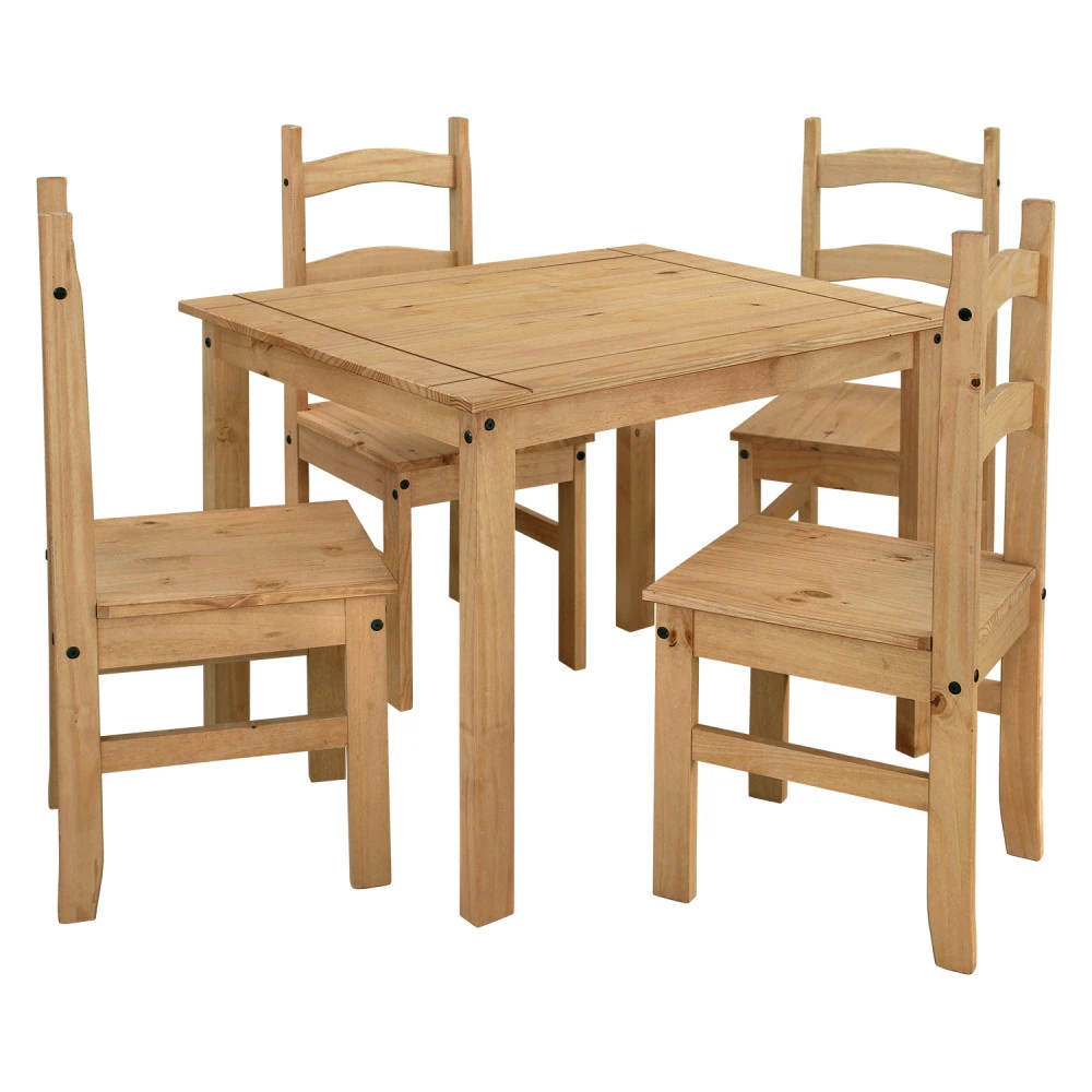 materiál masiv borovice voskovaná v medovém odstínu rozměr stolu (š/h/v) 100 × 80 × 75 cm rozměr židle (š/h/v) 40 × 48 × 99 cm, výška sedu 45 cm součást sestavy Corona 3