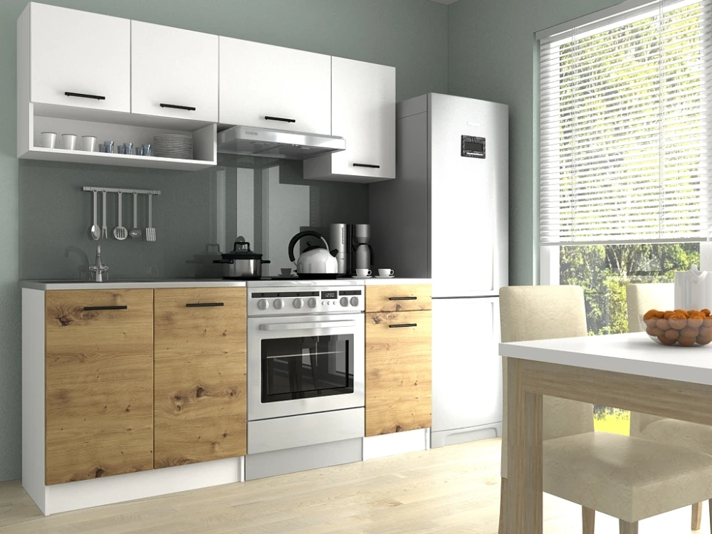 Kuchyňská linka Luigi je ideální volbou pro Vaši kuchyň. Je moderní a zároveň i praktická. Skříňky nabízejí dostatek úložného prostoru. Korpusy skříněk jsou bílé, dvířka jsou z lamina v dekoru dřeva. Vybrat si můžete ze tří variant dekoru a ze čtyř rozměrů, které jsou 120/180, 180/240 cm, 200/260 cm, 260/320 cm. Všechny tyto varianty najdete v naší nabídce a určitě si vyberete tu nejvhodnější pro Vaši kuchyň. Skříňky jsou dodávány v demontu. Součástí je montážní plánek včetně všech potřebných spojovacích materiálů. Cena je uvedena za sestavu vyobrazenou na úvodní fotografii BEZ PRACOVNÍ DESKY. Vyobrazené spotřebiče a dekorace nejsou v ceně.