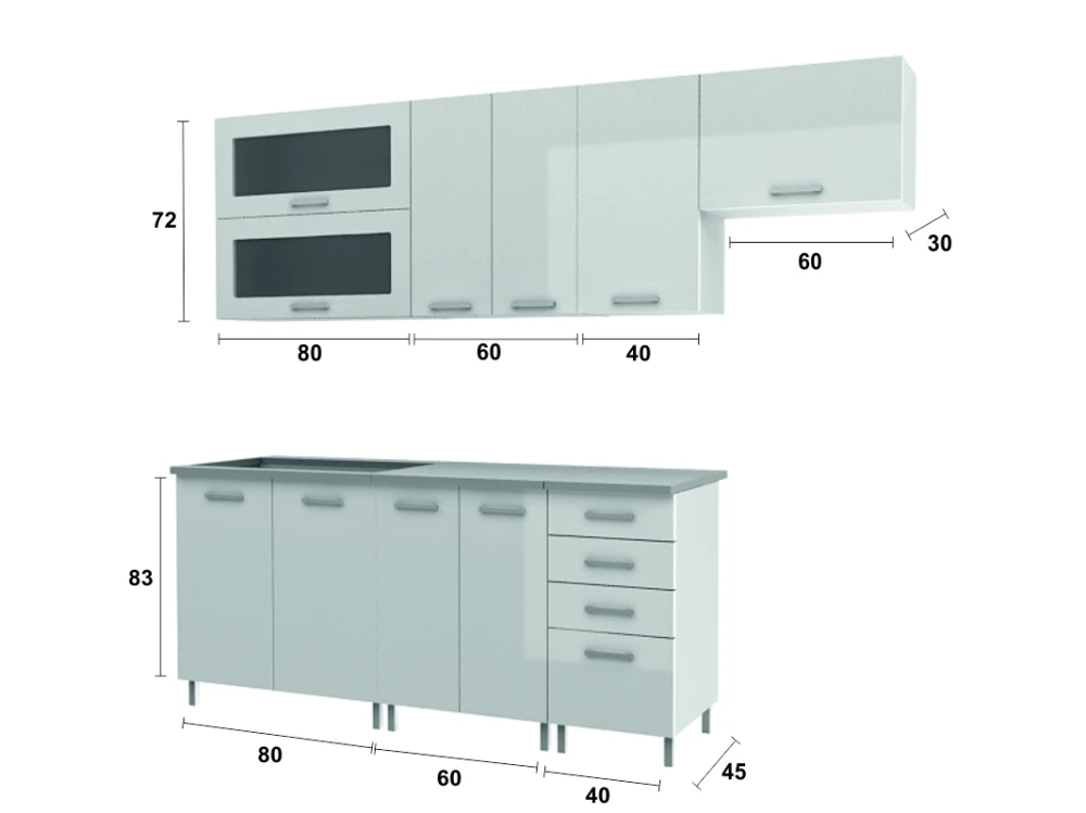 Kuchyňská linka Nadine v moderním designu je ideální volbou pro panelákové kuchyně, ale hodí se i do kuchyní v rodinných domech. Kuchyňská linka je na nožkách a díky tomu je prostor pod linkou lépe přístupný při úklidu. Korpusy skříněk jsou bílé, dvířka jsou ve vysokém lesku ve třech módních odstínech a se třemi typy úchytek. Všechny tyto varianty najdete v naší nabídce. Skříňky jsou dodávány v demontu. Součástí je montážní plánek včetně všech potřebných spojovacích materiálů. Cena je uvedna za sestavu vyobrazenou na úvodní fotografii BEZ PRACOVNÍ DESKY, s úchytkami, které jsou vyobrazeny v doplňkové fotografii. Vyobrazené spotřebiče a dekorace nejsou v ceně.