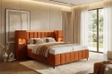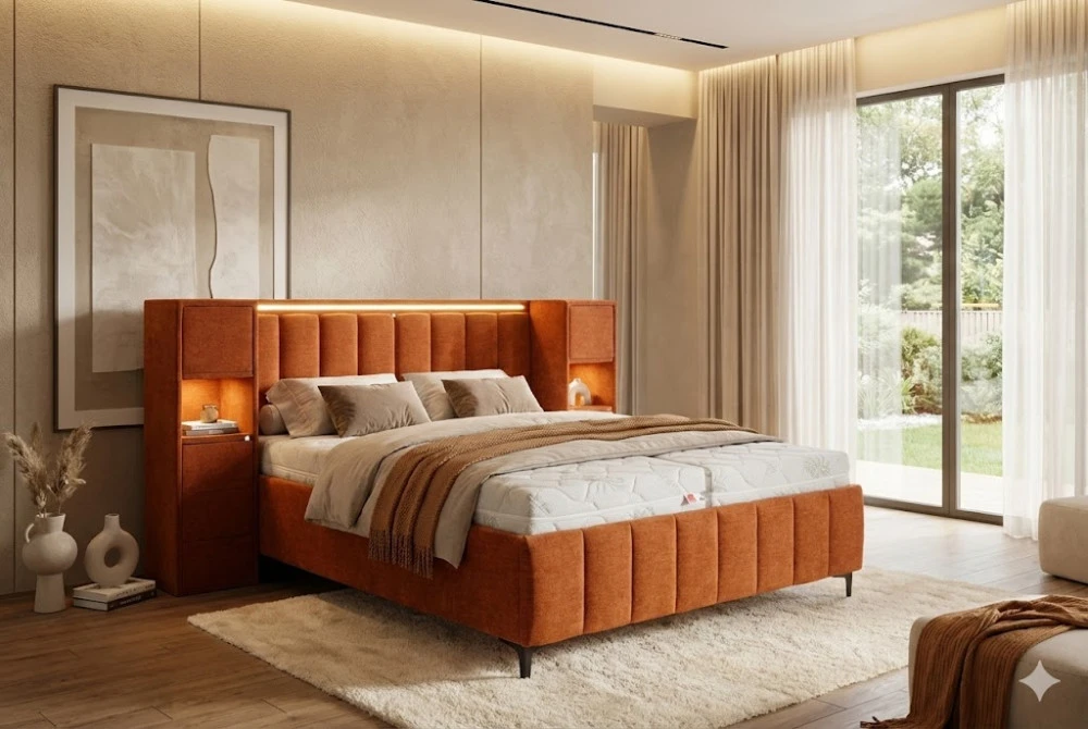 Součástí postele jsou integrované boční skříňky, které nabízí funkce, jež u běžných lůžek nenajdete. Každá skříňka kombinuje otevřené i uzavřené úložné prostory, zásuvky a vnitřní LED podsvícení v teplém tónu. Poslouží jako elegantní noční stolek i jako skrytý úložný prostor pro drobnosti či elektroniku. Vnitřní police v panelu mají praktické rozměry - šířka 31 cm a hloubka 35 cm, takže nabídnou dostatek prostoru pro knihy, dekorace či další drobnosti.