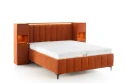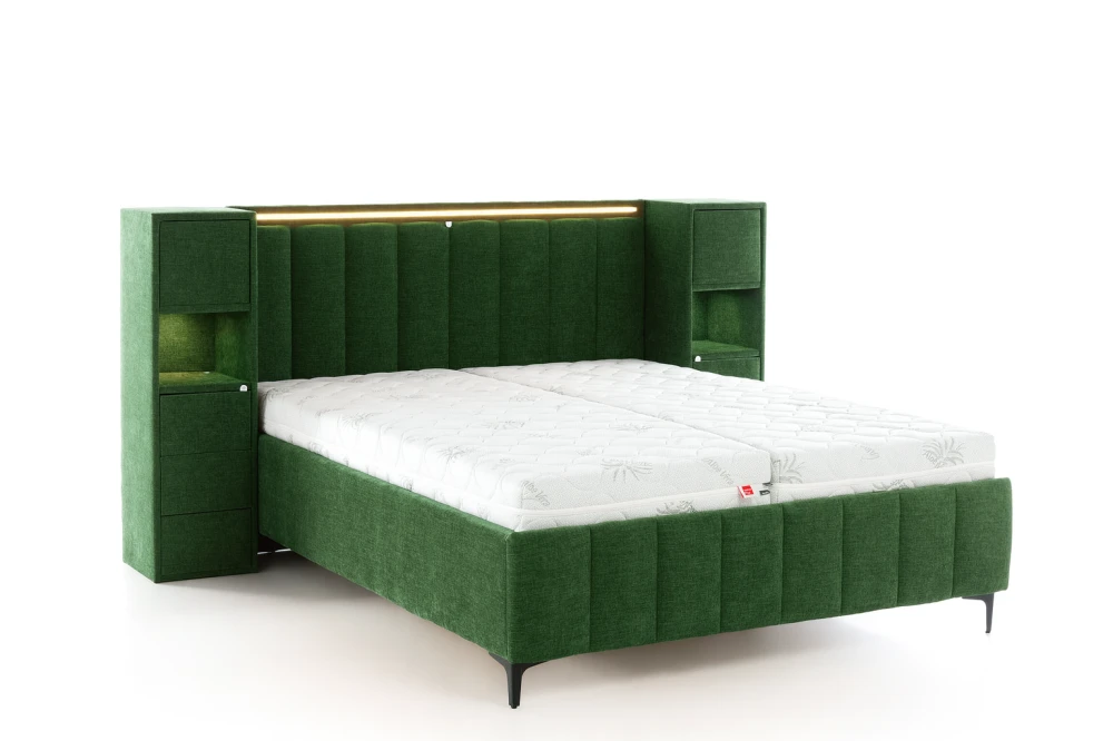 Součástí postele jsou integrované boční skříňky, které nabízí funkce, jež u běžných lůžek nenajdete. Každá skříňka kombinuje otevřené i uzavřené úložné prostory, zásuvky a vnitřní LED podsvícení v teplém tónu. Poslouží jako elegantní noční stolek i jako skrytý úložný prostor pro drobnosti či elektroniku. Vnitřní police v panelu mají praktické rozměry - šířka 31 cm a hloubka 35 cm, takže nabídnou dostatek prostoru pro knihy, dekorace či další drobnosti.
