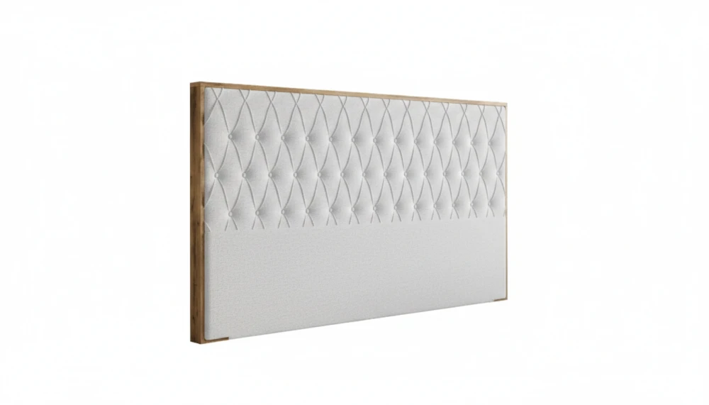 Model Wood 6 představuje spojení klasické elegance a moderního zpracování. Výrazné horní čalounění s dekorativním prošíváním doplňuje pevný rám z lamina v dekoru dub wotan, který čelu dodává pevnost a přírodní akcent. Kontrast mezi dřevem a jemnou látkou vytváří luxusní, ale stále velmi útulný vzhled. Horní část je zdobena pravidelným kosočtvercovým prošíváním s jemnými knoflíky, které vytvářejí plastický efekt a dodávají čelu reprezentativní charakter. Spodní segment zůstává hladký a klidný, čímž vyvažuje dekorativní horní část a udržuje celkový design harmonický.