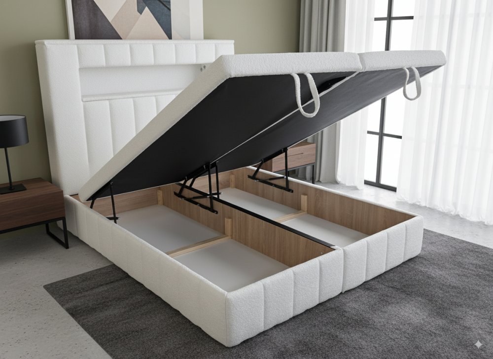 Pod matracemi je velký úložný prostor, kam snadno uložíte ložní prádlo, sezónní oblečení nebo jiné věci. Postel má pevný masivní rošt čalouněný látkou podle vašeho výběru. Konstrukce roštu unese až 150 kg na osobu, což zajišťuje stabilitu, dlouhou životnost a odolnost při každodenním používání.