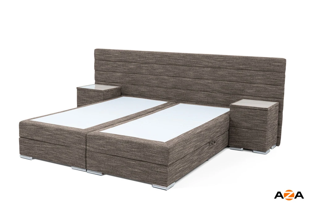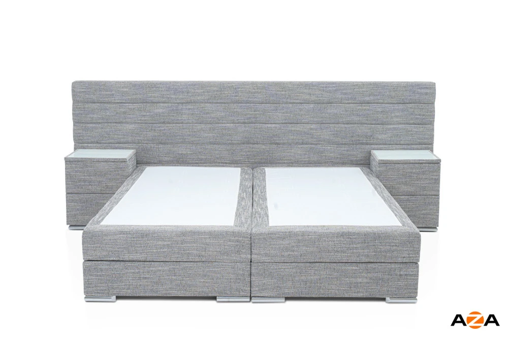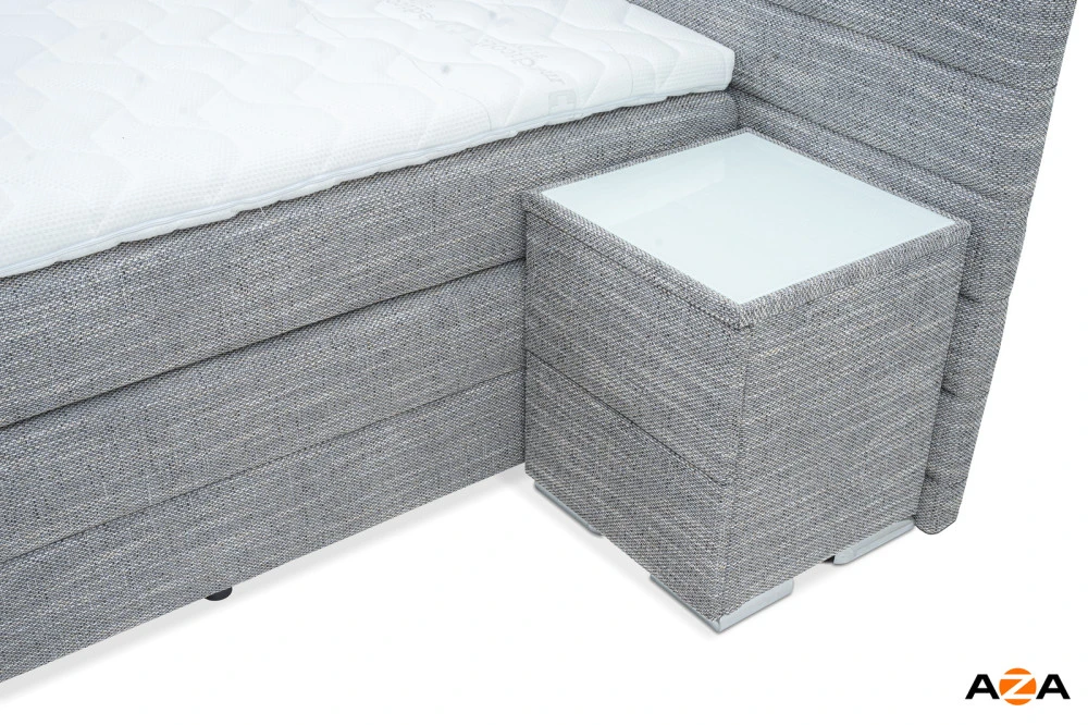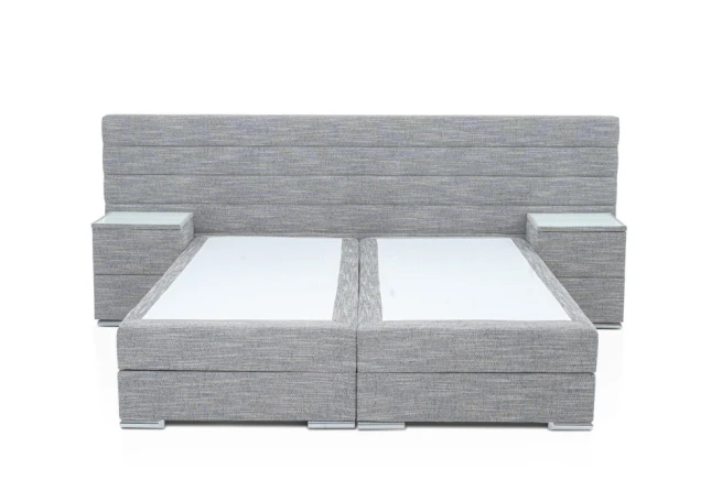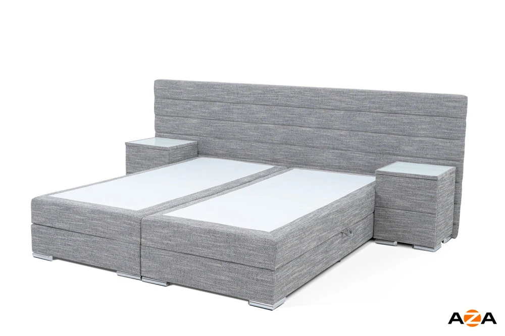 Na první pohled zaujme širokým čelem s horizontálním prošíváním, které působí čistě, uklidňujícím dojmem a zároveň poskytuje komfortní oporu při odpočinku. Celek doplňují čalouněné noční stolky s elegantními skleněnými deskami, díky nimž máš vše potřebné vždy po ruce. Tyto noční stolky jsou zahrnuty v ceně postele, ale lze postel objednat i bez nich. Čalouněné noční stolky nabízejí praktické dvě zásuvky pro uložení osobních věcí. Postel svým čelem přesahuje na každou stranu přibližně o 50 cm, aby vytvořila prostor pro čalouněné noční stolky. Rozměry jednoho stolku jsou 46 × 46 × 53 cm (hloubka × šířka × výška).