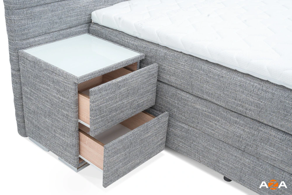 Srdcem postele je dvouvrstvý boxspring systém, který spojuje luxusní komfort s maximální praktičností. Spodní pevný box tvoří stabilní základ celé konstrukce a zároveň v sobě skrývá velký úložný prostor. Ten je snadno přístupný díky kvalitnímu výklopnému mechanismu a poskytne místo pro lůžkoviny, sezónní oblečení či další věci, které chceš mít po ruce, ale ne na očích.