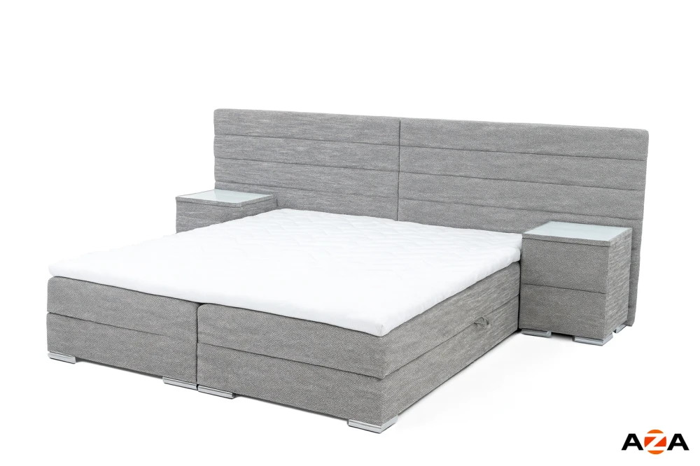 Na první pohled zaujme širokým čelem s horizontálním prošíváním, které působí čistě, uklidňujícím dojmem a zároveň poskytuje komfortní oporu při odpočinku. Celek doplňují čalouněné noční stolky s elegantními skleněnými deskami, díky nimž máš vše potřebné vždy po ruce. Tyto noční stolky jsou zahrnuty v ceně postele, ale lze postel objednat i bez nich. Čalouněné noční stolky nabízejí praktické dvě zásuvky pro uložení osobních věcí. Postel svým čelem přesahuje na každou stranu přibližně o 50 cm, aby vytvořila prostor pro čalouněné noční stolky. Rozměry jednoho stolku jsou 46 × 46 × 53 cm (hloubka × šířka × výška). U tohoto rozměru je čelo rozděleno na dvě části pro snazší manipulaci. Na přání jej však můžeme vyrobit i v celku.