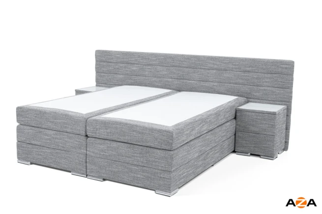 Boxspring postel Berlin 2 je ztělesněním luxusu, pohodlí a moderní elegance. Na první pohled zaujme širokým čelem s horizontálním prošíváním, které působí čistě a uklidňujícím dojmem. Zároveň poskytuje komfortní oporu při odpočinku i čtení. Celek dokonale doplňují čalouněné noční stolky se skleněnými deskami, díky nimž máš vše potřebné vždy po ruce. Tyto stolky jsou zahrnuty v ceně postele, ale na přání lze postel objednat i bez nich. Nabízejí dvě praktické zásuvky pro uložení osobních věcí. Čelo postele přesahuje na každou stranu přibližně o 50 cm, aby vytvořilo prostor právě pro tyto stolky. Rozměry jednoho stolku jsou 46 × 46 × 53 cm (hloubka × šířka × výška). U tohoto rozměru je čelo rozděleno na dvě části pro snazší manipulaci. Na přání jej však můžeme vyrobit i v celku.