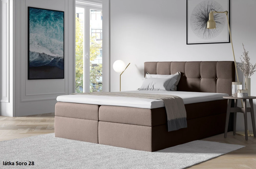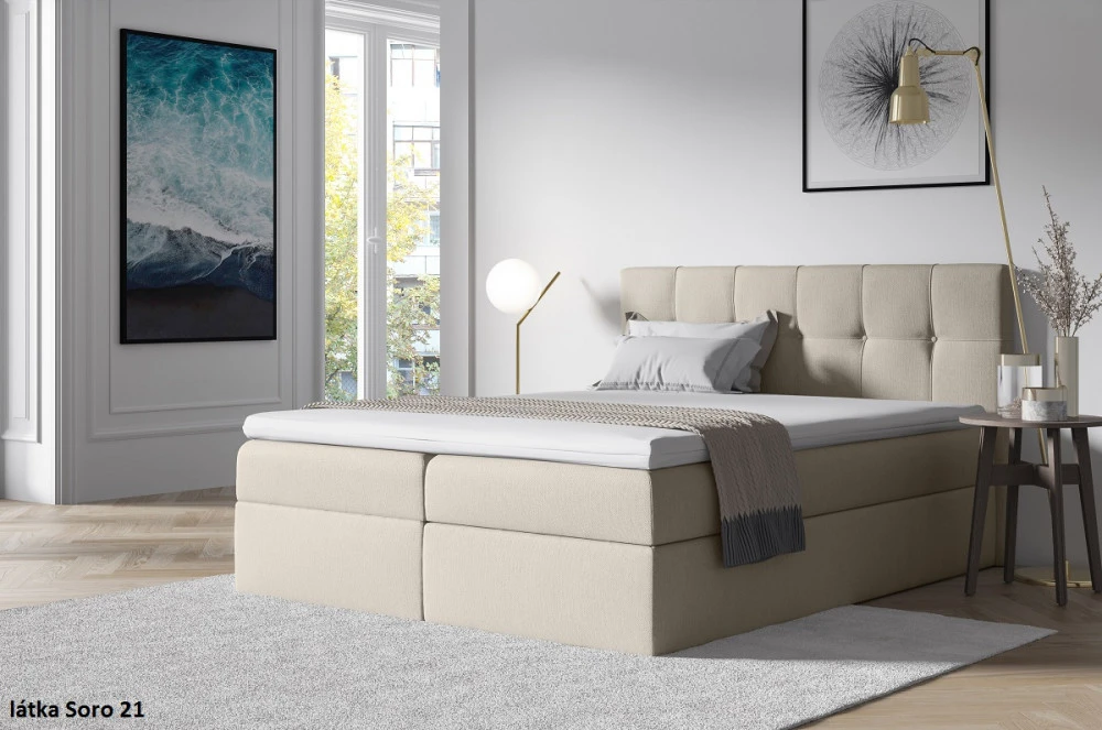 Boxspring postel Empire je čalouněná postel sestavena pečlivě z kvalitních materiálů, které zajišťují pevnost a odolnost. Dřevěný rám přispívá k celkové stabilitě, zatímco pružinové jádro poskytuje vynikající podporu a komfort při spánku.