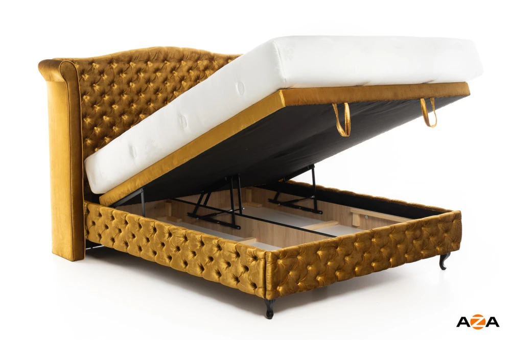 Postel spojuje dokonalý komfort boxspringového lůžka s praktickým úložným prostorem, který oceníte v každé domácnosti. Pevný masivní rošt je čalouněný látkou dle vašeho výběru a díky pístovému mechanismu se snadno a bez námahy zvedá. Rošt je zarovnán s horní hranou bočnic, což zajišťuje čistý a moderní vzhled. S nosností až 150 kg na osobu poskytuje výjimečnou stabilitu, odolnost a dlouhou životnost.