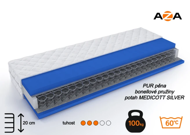 Bonellová matrace Aza T-3 Matrace Aza T-3 představuje osvědčené řešení pro pohodlný a stabilní spánek. Díky bonellové konstrukci se střední tuhostí T-3 zajišťuje rovnoměrné rozložení váhy a spolehlivou oporu po celé ploše. Není určena pro polohovací rošty. Vlastní výroba Aza…Zobrazit více