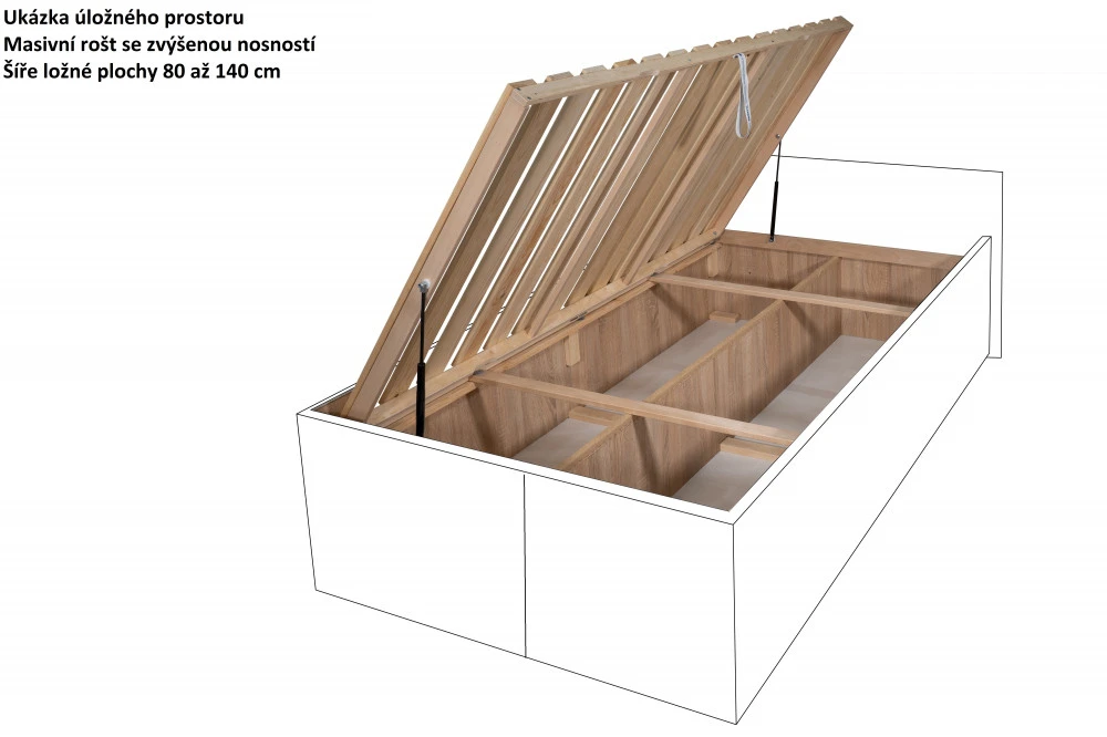 Laťový masivní rošt Výklopný laťový rošt bez polohování, otevírání je pomocí pístů z boku. Rošt se skládá z 19ti masivních latí a jeho nosnost je 150 kg na osobu.