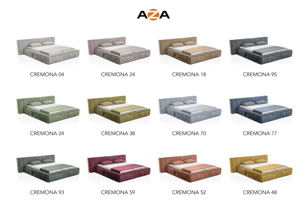 Postel Cremona vzniká v naší vlastní dílně AZA nábytek, kde každý kus projde rukama zkušených čalouníků. To je záruka precizního zpracování a dlouhé životnosti. Vybrat si můžete jakoukoli barvu či materiál ze vzorníku bez příplatku, a sestavit si tak postel, která dokonale zapadne do vašeho interiéru.
