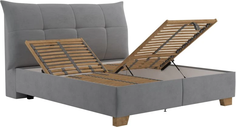 Úložný prostor se otevírá od nohou postele pomocí plynových pístů, které umožňují snadné a plynulé zvedání roštů.