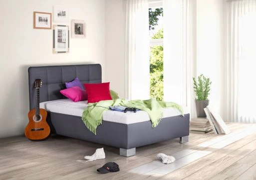 Kelvin je moderní postel s prošívaným čelem a kvalitní sendvičovou matrací, která je volně ložená na polohovacím lamelovém roštu. Je oblíbená hlavně mezi teenagery a je také vhodná do studentských pokojů, nebo pokojů pro hosty. Postel má velký úložný prostor na lůžkoviny, který má přístup od nohou pomocí plynových pístů. Rošt má 28 lamel s nastavením tuhosti a popruh proti přetížení. Plocha pro spaní je 120x200 cm, s výškou lehací plochy cca 53 cm. Doporučená nosnost je do 110 kg. Čelo i korpus postele jsou potaženy EKO kůží, matrace má snímatelný a pratelný potah. Cena postele je uvedena včetně roštu a matrace.
