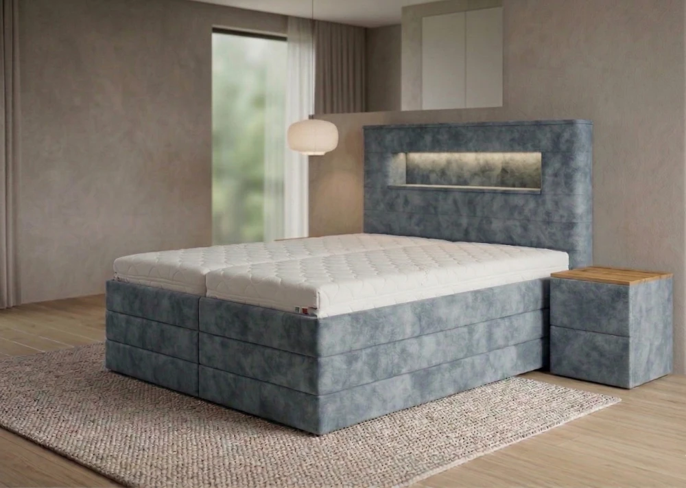 Čelo postele je vybaveno jemným LED podsvícením, které vytváří příjemnou atmosféru pro večerní relax. Vypínač LED osvětlení je standardně umístěn na pravé straně při pohledu na postel, ale po dohodě jej lze umístit i na jiné místo podle vašich preferencí.