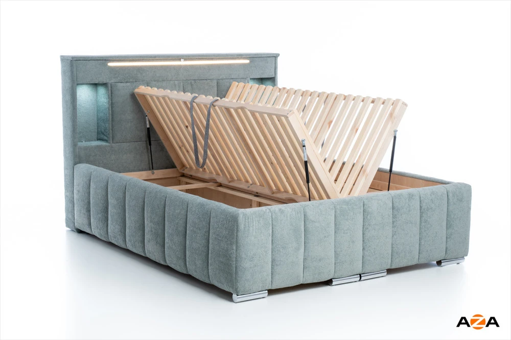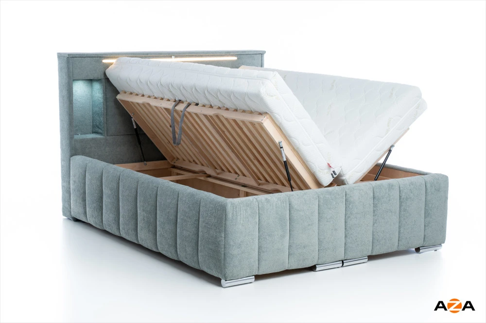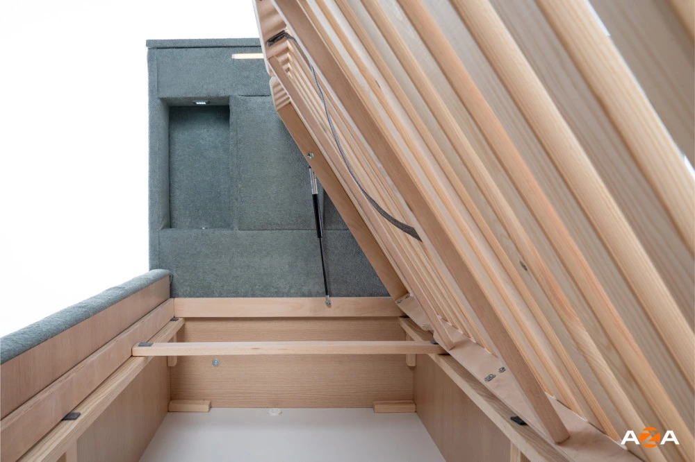 Postel Monty je vybavena skrytým úložným prostorem z vrchu čela postele, který je přístupný pomocí odklápěcího systému. Tento prostor je ideální pro uschování cenností, peněz nebo jiných osobních věcí, které si chcete uchovat v soukromí a mimo zvědavé pohledy. Otevírání tohoto prostoru je velmi snadné a tiché – stačí jemně stlačit vrchní část čela postele.