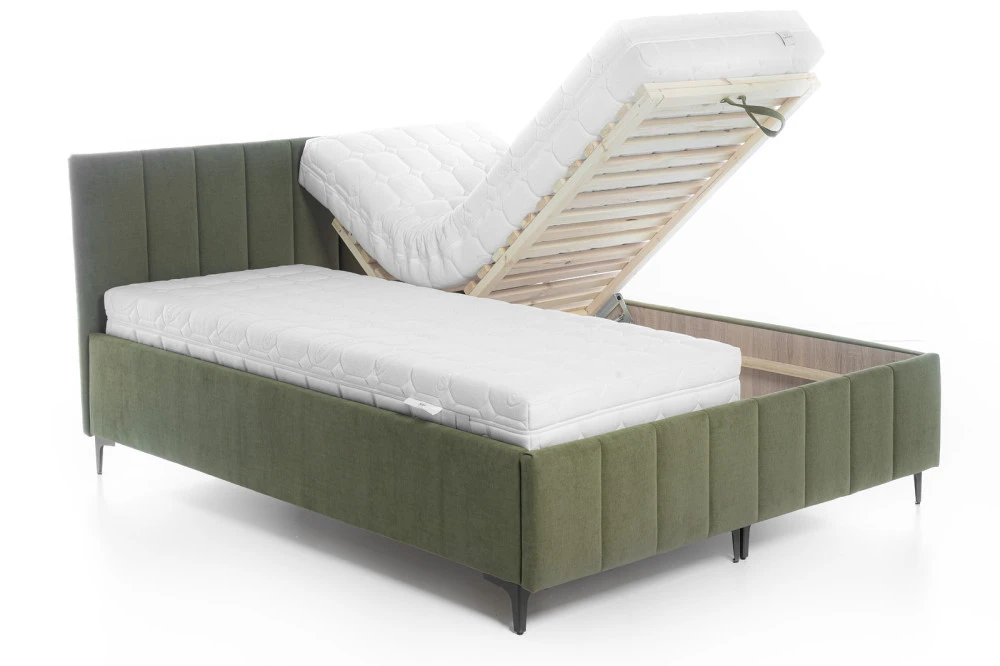Čalouněná postel s polohovacím roštem je potažena voděodolnou látkou v elegantní tmavě mátové barvě.