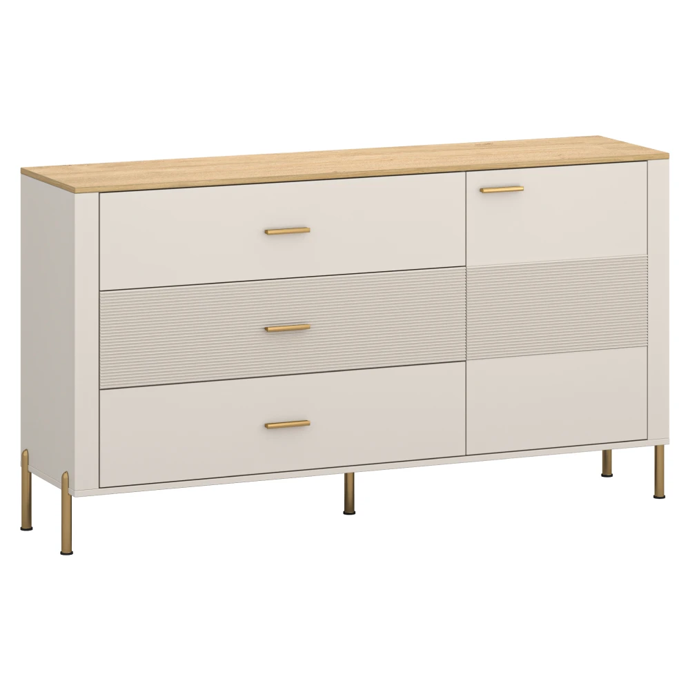 Moderní komoda RUNOL v kombinaci kašmír a dub kamenný nabízí ideální spojení designu a praktičnosti. Díky jemnému barevnému provedení a zlatým detailům působí elegantně a snadno zapadne do obývacího pokoje, ložnice i předsíně.