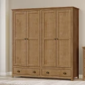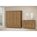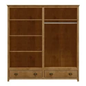 materiál masiv borovice, barevné provedení dub dvě zásuvky s kovovými úchytkami a pojezdy v levé části 3 police, v pravé části 1 police a kovová šatní tyč