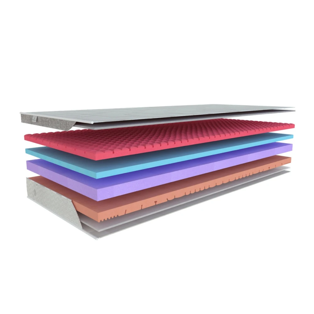Jádro matrace - Komfortní značková pěna ELIOCELL: Tato část matrace tvoří její střed a poskytuje hlavní podporu tělu. Využívá se dva typy pěny ELIOCELL s hustotou 25 kg/m³. První vrstva je měkčená a nabízí pružnost a měkkost pro komfortní spánek. Druhá vrstva je rovněž z ELIOCELL, ale s větším důrazem na podporu a tuhost, což zajišťuje, že tělo je správně podporováno a nemá tendenci propadávat.