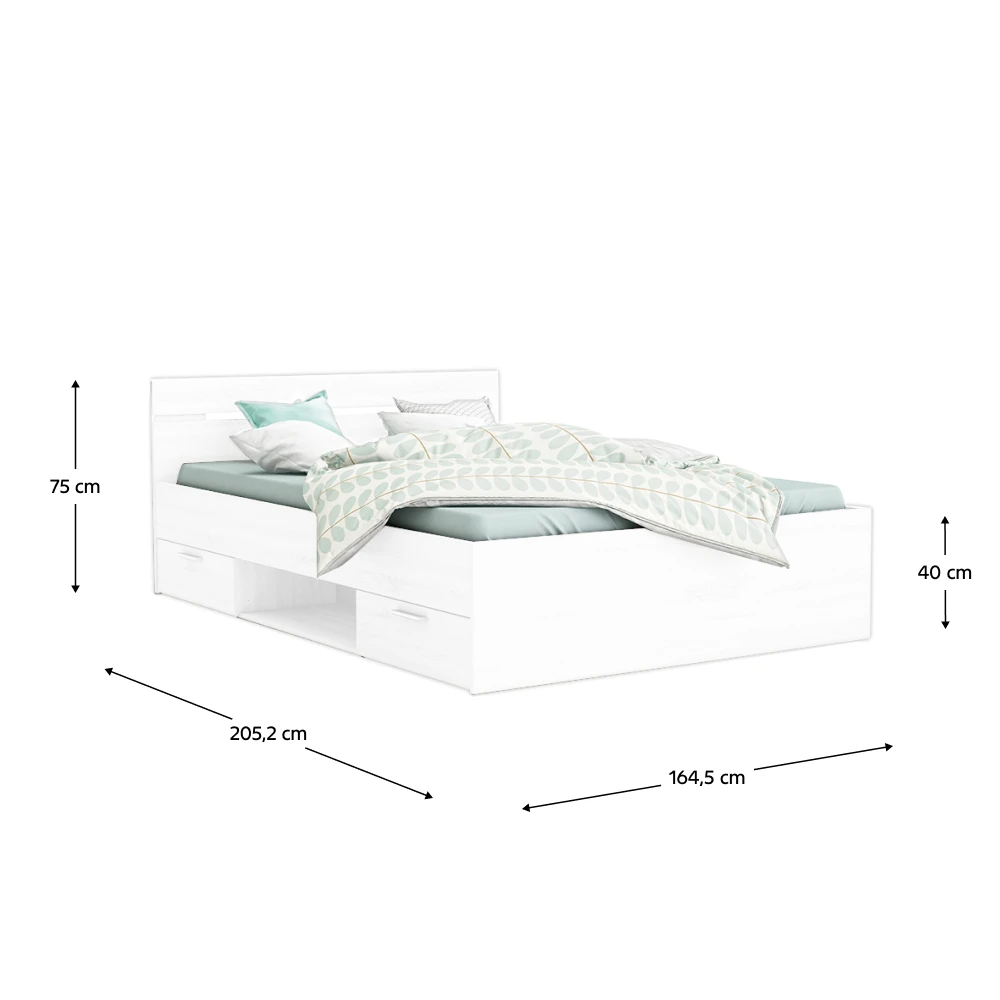 Postel je vyrobena z kvalitní laminované DTD desky, která zajišťuje vysokou pevnost, stabilitu a dlouhou životnost. Rozměry 164,5×205,2×75 cm poskytují pohodlnou spací plochu 160×200 cm, ideální pro dvě osoby. Díky výšce spaní 40 cm a výšce po rošt 26 cm nabízí komfortní vstávání i příjemné uložení na spánek.