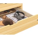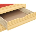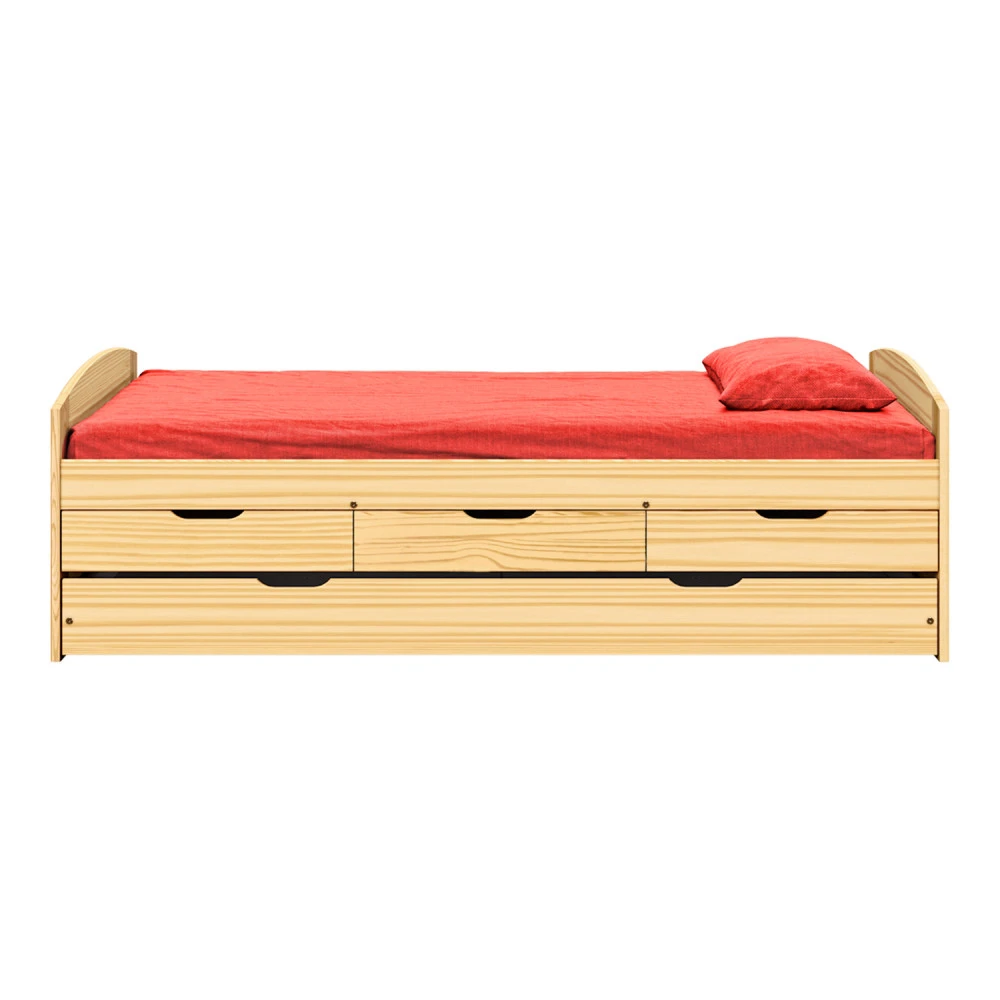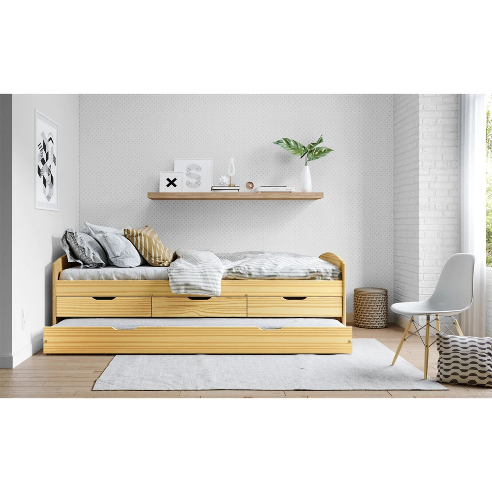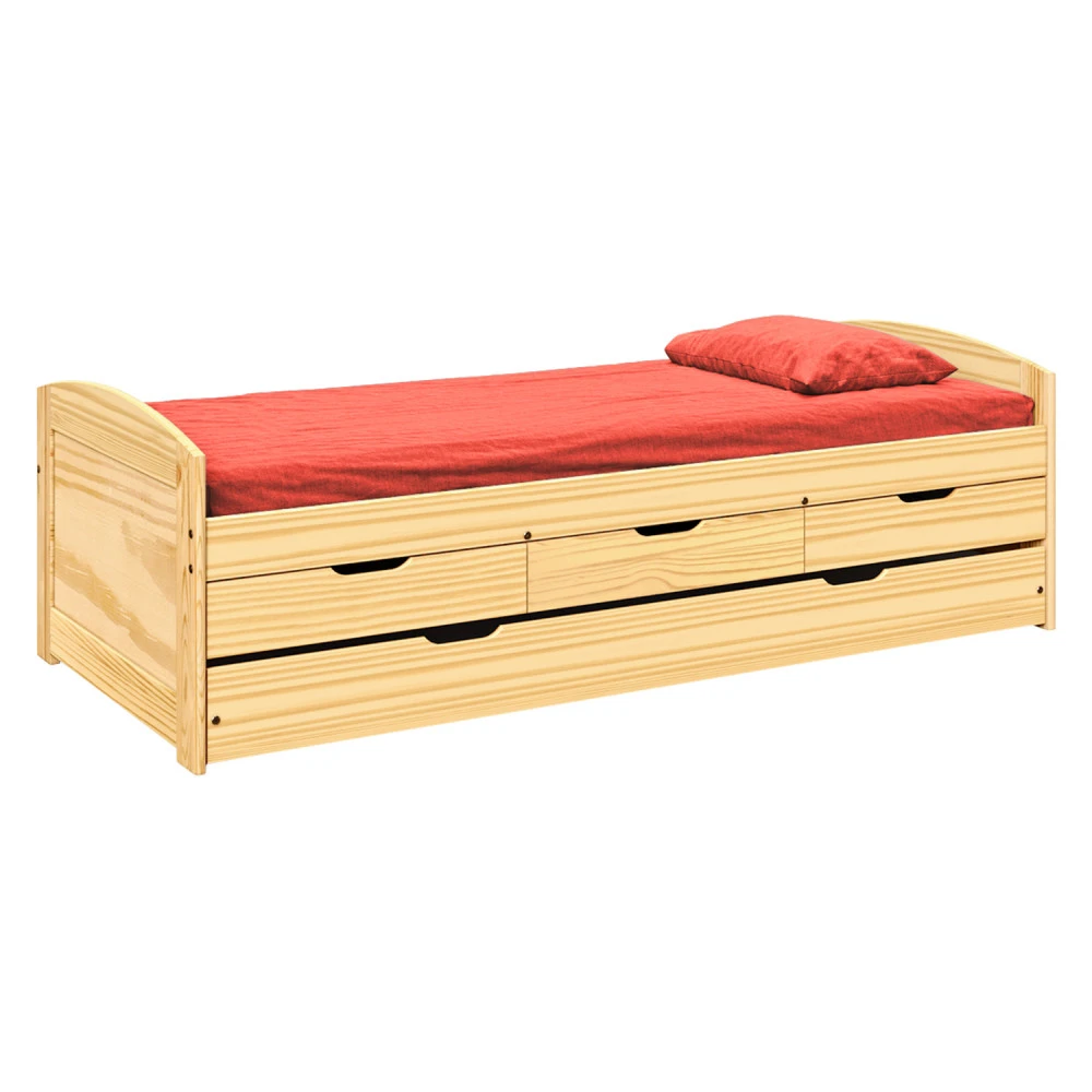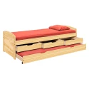 materiál masiv borovice, lakované provedení výška sedu 52 cm, praktické úložné prostory pod postelí (3 zásuvky a výsuv) jsou v ceně cena včetně roštu (dřevěný laťkový) bez matrace, doporučený rozměr matrace 90 × 200 cm doporučená výška matrace pro přistýlku je do 10 cm