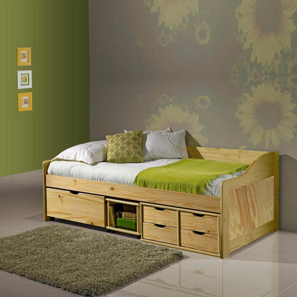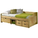 materiál masiv borovice, lakované provedení praktické úložné prostory pod postelí (zásuvky a otevřená police) v ceně výška sedu 50 cm, cena včetně roštu (dřevěný laťkový), matrace není v ceně doporučený rozměr matrace 90 × 200 cm (M2, M5, M9, M12, M14, M24, M26) jako vhodný doplněk doporučujeme čalouněný válec M10  hloubka široké zásuvky 65,5 cm, hloubka malých zásuvek 39 cm, hloubka otevřené police 44,5 cm
