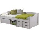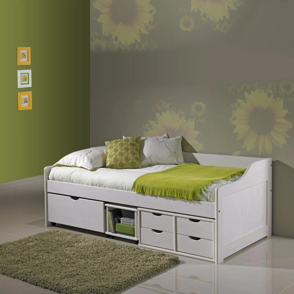 materiál masiv borovice, barevné provedení bílý lak praktické úložné prostory pod postelí (zásuvky a otevřená police) v ceně výška sedu 50 cm, cena včetně roštu (dřevěný laťkový), matrace není v ceně doporučený rozměr matrace 90 × 200 cm (M2, M5, M9, M12, M14, M24, M26) jako vhodný doplněk doporučujeme čalouněný válec M10 hloubka široké zásuvky 65,5 cm, hloubka malých zásuvek 39 cm, hloubka otevřené police 44,5 cm