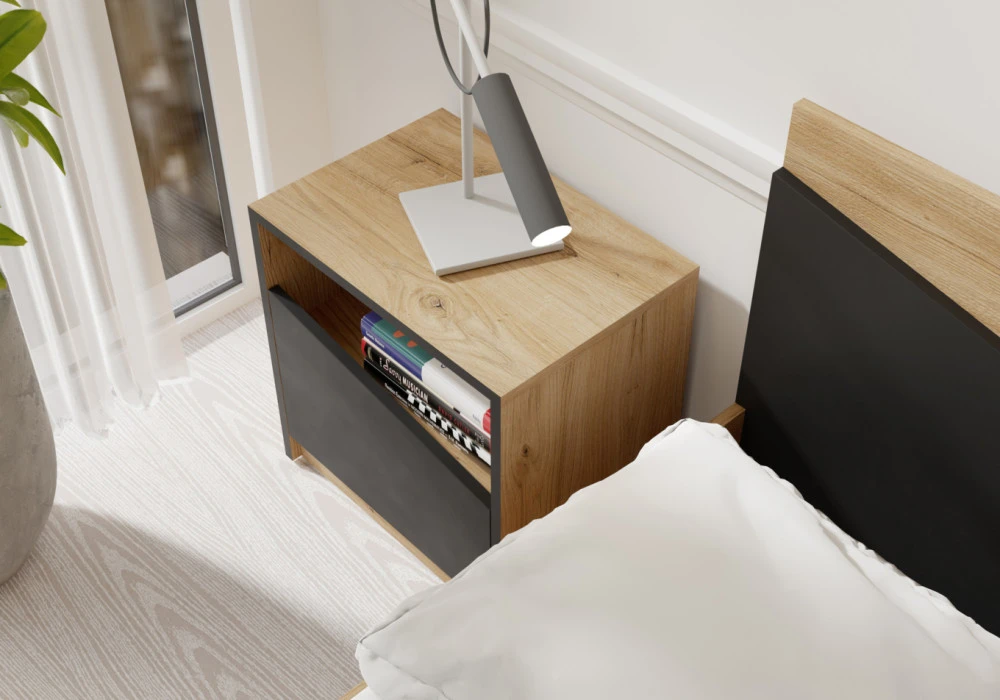 Ložnice je místem, kde má vládnout pohodlí, harmonie a styl. Postel Asim R9 v provedení dub v kombinaci s černou barvou přináší do interiéru elegantní kontrast a vytváří prostor, ve kterém se budeš cítit příjemně každý den.