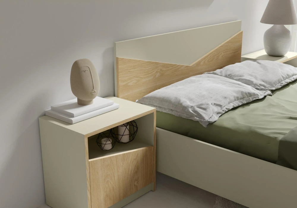Ložnice je místem, kde hraje hlavní roli pohodlí a harmonie. Postel Asim R9 v elegantním provedení dub v kombinaci se šedobéžovou barvou přináší do interiéru moderní vzhled s jemným přírodním nádechem.