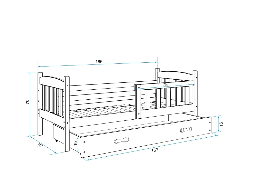 Dětská postel Kuba je určena pro ty, kteří pro své dítě hledají funkčnost, pohodlí a kvalitu. Postel je vyrobena z borovicového dřeva. Na lakování je použitý bezpečný, vodou ředitelný lak vyhovující normám. Její stabilní konstrukce, zaoblené hrany a zábrana, která je v ceně postele, zajišťují bezpečnost dítěte. Zábranu si můžete podle potřeby umístit na pravou, nebo levou stranu postele. Součástí postele je také praktický úložný prostor na kolečkách, rošt a pěnová matrace se snímatelným potahem. Tloušťka matrace je 7cm. Plocha pro spaní je 80x160 cm. Postel je dodávána v demontu a součástí je montážní plánek včetně všech potřebných spojovacích materiálů. Vyobrazené dekorace nejsou v ceně.