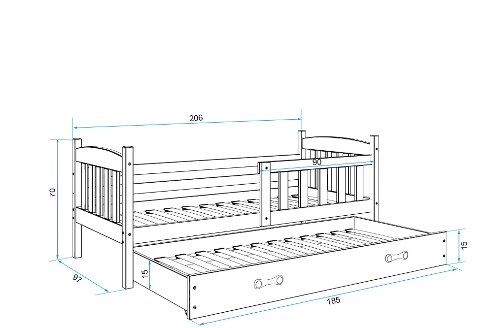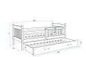 Součástí postele je praktická výsuvná přistýlka s matrací, ideální pro druhé dítě nebo občasné přespání hostů. Obě části postele mají lamelový rošt a pěnovou matraci se snímatelným potahem, kterou lze snadno vyprat. Tloušťka matrace je 7 cm, ložná plocha hlavního lůžka 90 × 200 cm a přistýlky 80 × 190 cm.