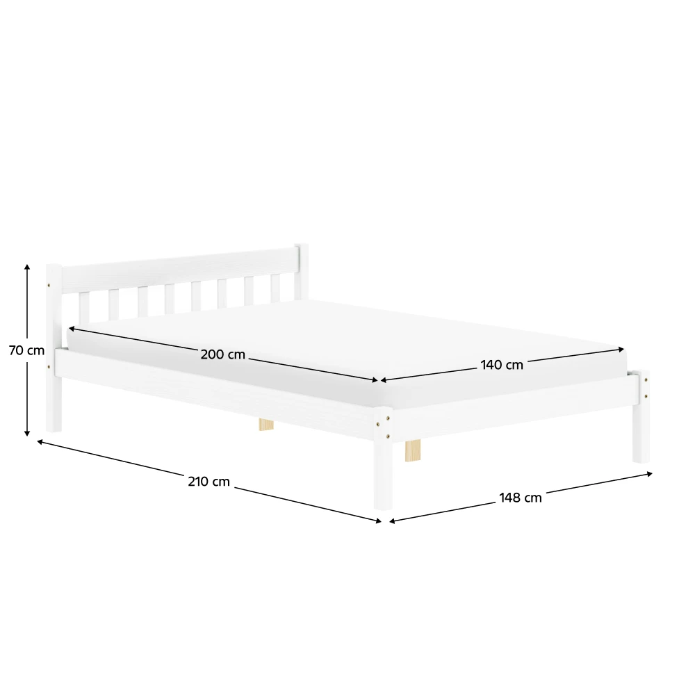 Postel o rozměrech 148×210×70 cm a spací ploše 140×200 cm poskytuje dostatek prostoru pro pohodlný spánek jedné až dvou osob. Vyrobena je z masivního borového dřeva o tloušťce 2,5 cm, které zajišťuje výjimečnou stabilitu a dlouhou životnost. Nožičky o rozměrech 5×5 cm a výšce 36 cm dodávají posteli pevnost a zároveň vytvářejí dostatek prostoru pod lůžkem pro snadný úklid.