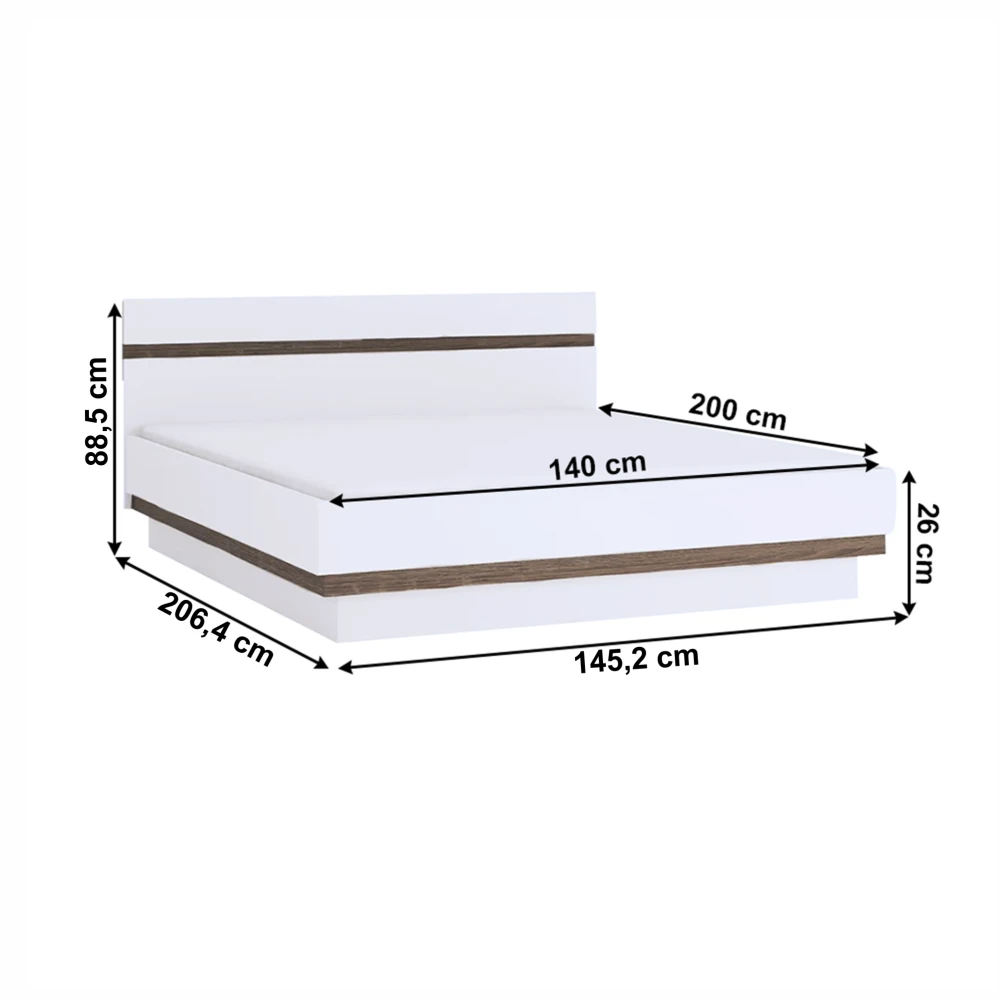 Rozměry postele 145,2×206,4×88,5 cm a spací plocha 140×200 cm poskytují komfortní prostor pro pohodlný spánek jedné až dvou osob. Korpus postele je v matném provedení, zatímco čelo se pyšní vysokým leskem, který opticky rozjasní prostor a dodá ložnici luxusní nádech. Výška po rošt 26 cm umožňuje snadné vstávání a ideální polohu pro odpočinek.
