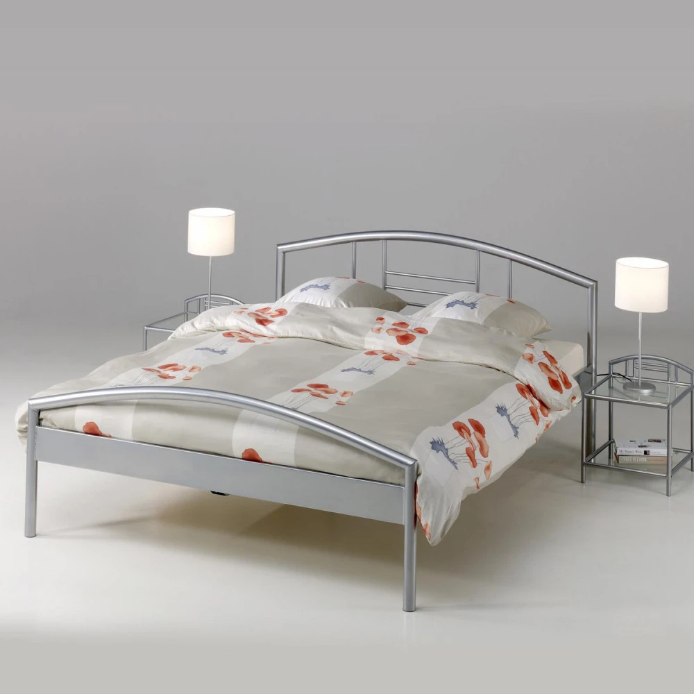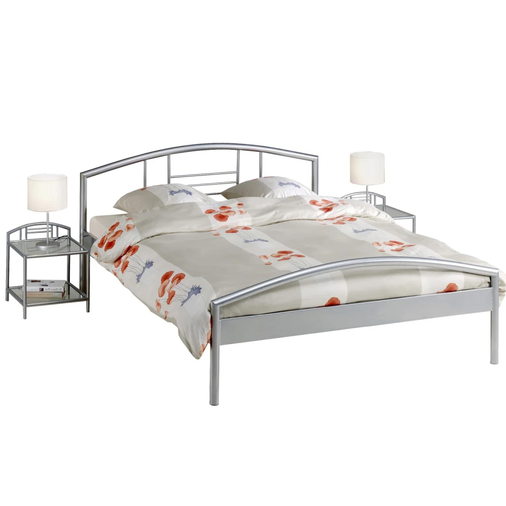 kovová konstrukce, barevné provedení stříbrná výška sedu 42 cm, cena bez roštu a matrace doporučený rozměr matrace 160 × 200 cm nebo 2 kusy 80 × 200 cm a rošt R2 noční stolky (3020), lampy a dekorace nejsou v ceně