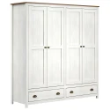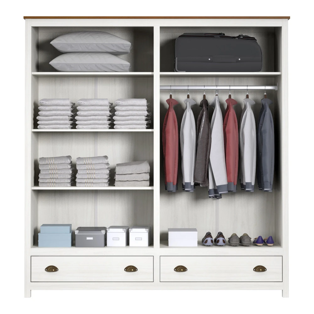 materiál masiv borovice, barevné provedení bílý / hnědý lak dvě zásuvky s kovovými úchytkami a pojezdy v levé části 3 police, v pravé části 1 police a kovová šatní tyč vhodný doplněk nástavec TOPAZIO 206953