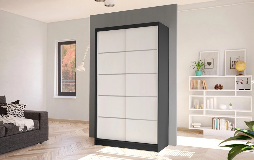 Velkou výhodou této skříně jsou posuvné dveře, které šetří místo při otevírání a zároveň zajišťují pohodlný přístup do celého interiéru. Tento systém je ideální zejména do menších místností, kde je důležité maximálně využít dostupný prostor.