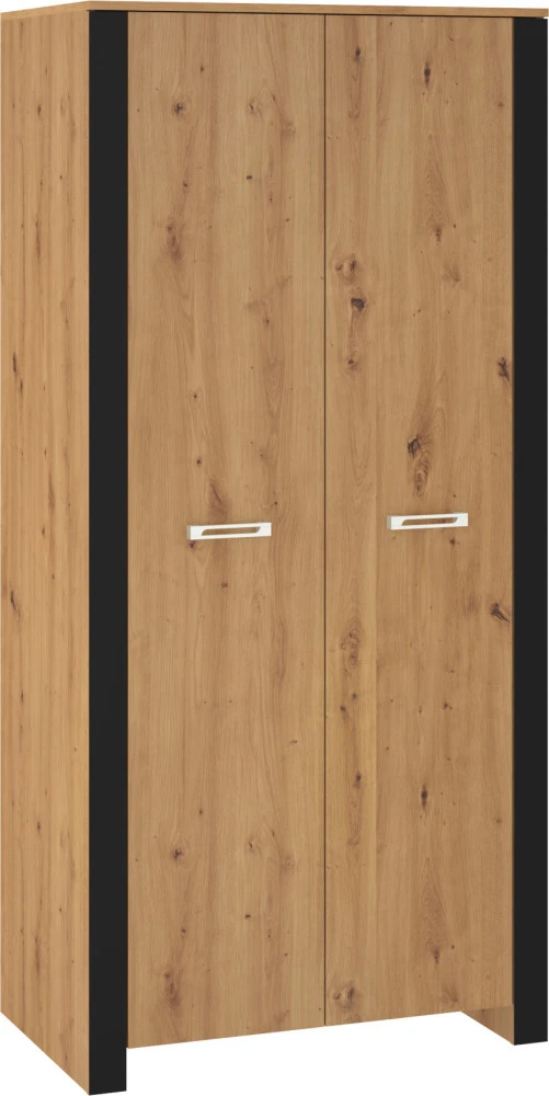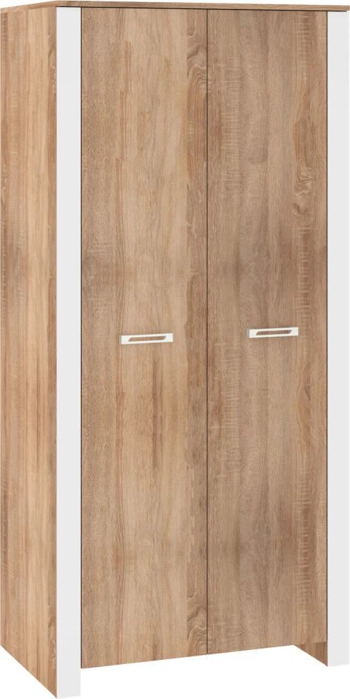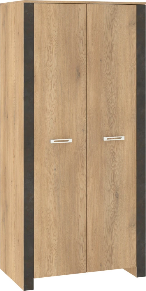 Dvoudveřová šatní skříň Hugo disponuje na levé straně dvěma šatními tyčemi a na pravé straně čtyřmi policemi. Nabízí dostatek úložného prostoru.