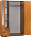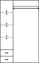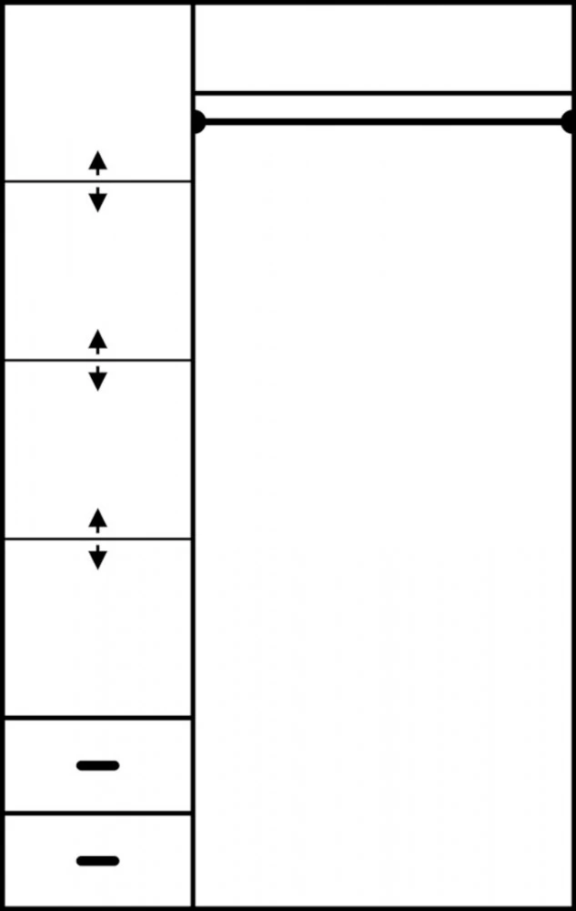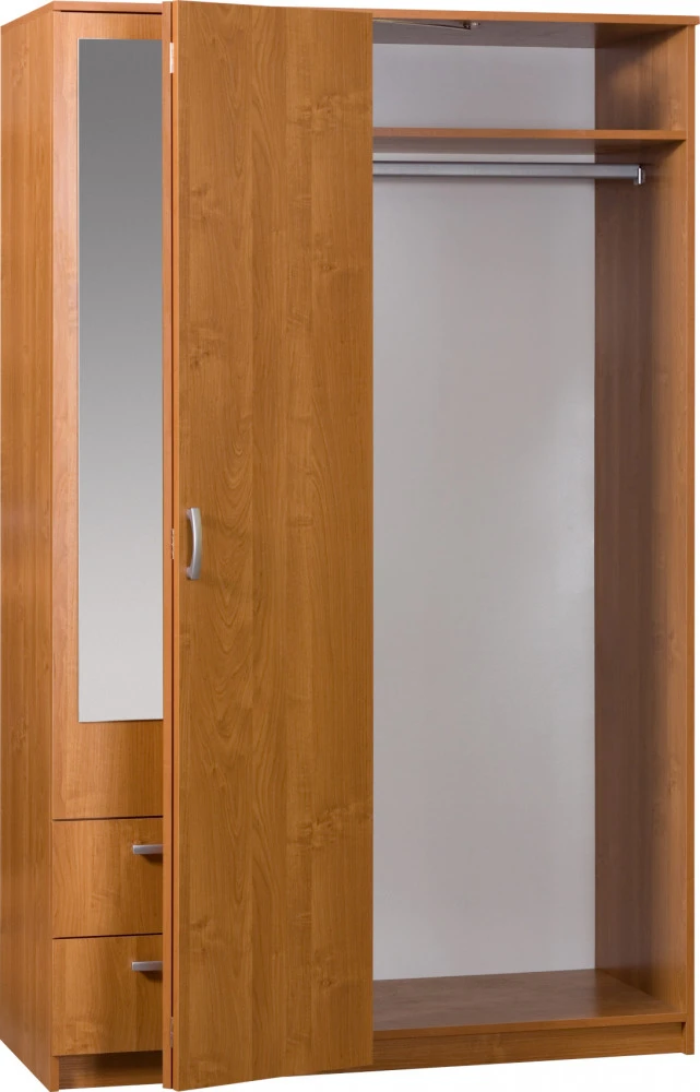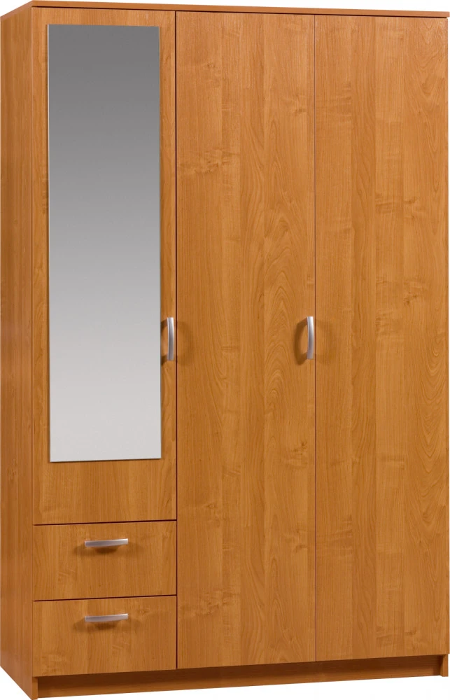 Praktická šatní skříň Venezia 1 se zrcadlem disponuje velkým úložným prostorem. V levé části jsou tři výškově nastavitelné police, ve spodní části jsou dvě zásuvky. Na pravé straně je police a šatní tyč (viz obrázek). Možnost libovolně namontovat zalamovací dveře na levou nebo pravou stranu. Materiál 16 mm lamino, na výběr z několika barevných variant. Dodáváno v demontu.
