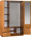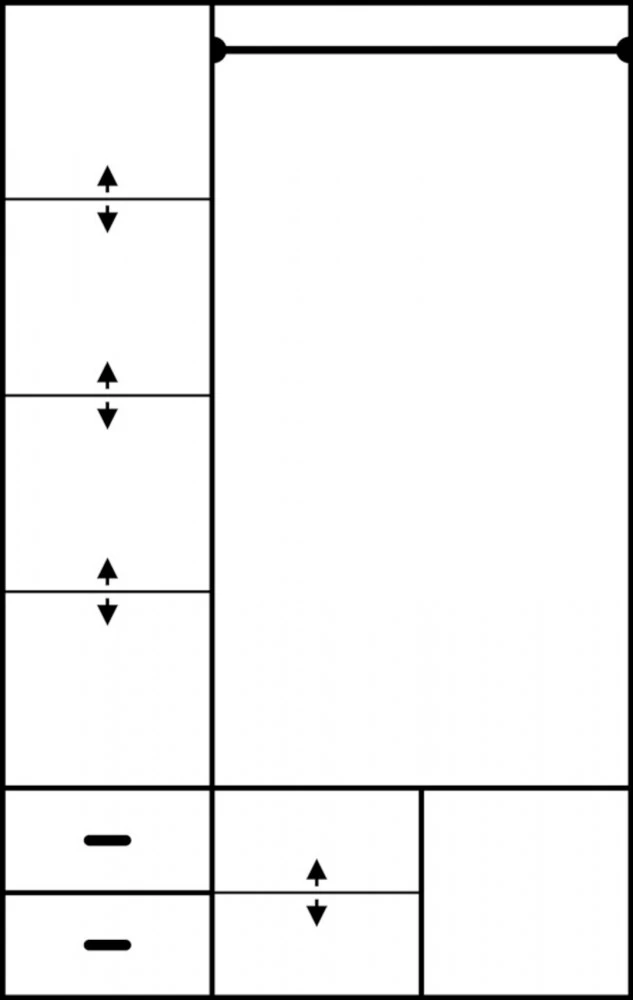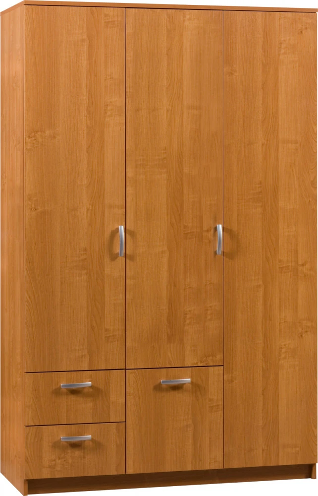 Praktická šatní skříň Venezia 2 bez zrcadla a se zalamovacími dveřmi, disponuje velkým úložným prostorem. V levé části jsou tři výškově nastavitelné police, ve spodní části jsou dvě zásuvky. Na pravé straně je police a šatní tyč, v dolní části jsou výklopná dvířka (viz obrázek). Materiál 16 mm lamino, na výběr z několika barevných variant. Dodáváno v demontu.