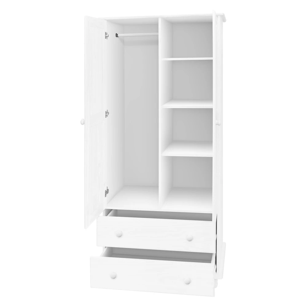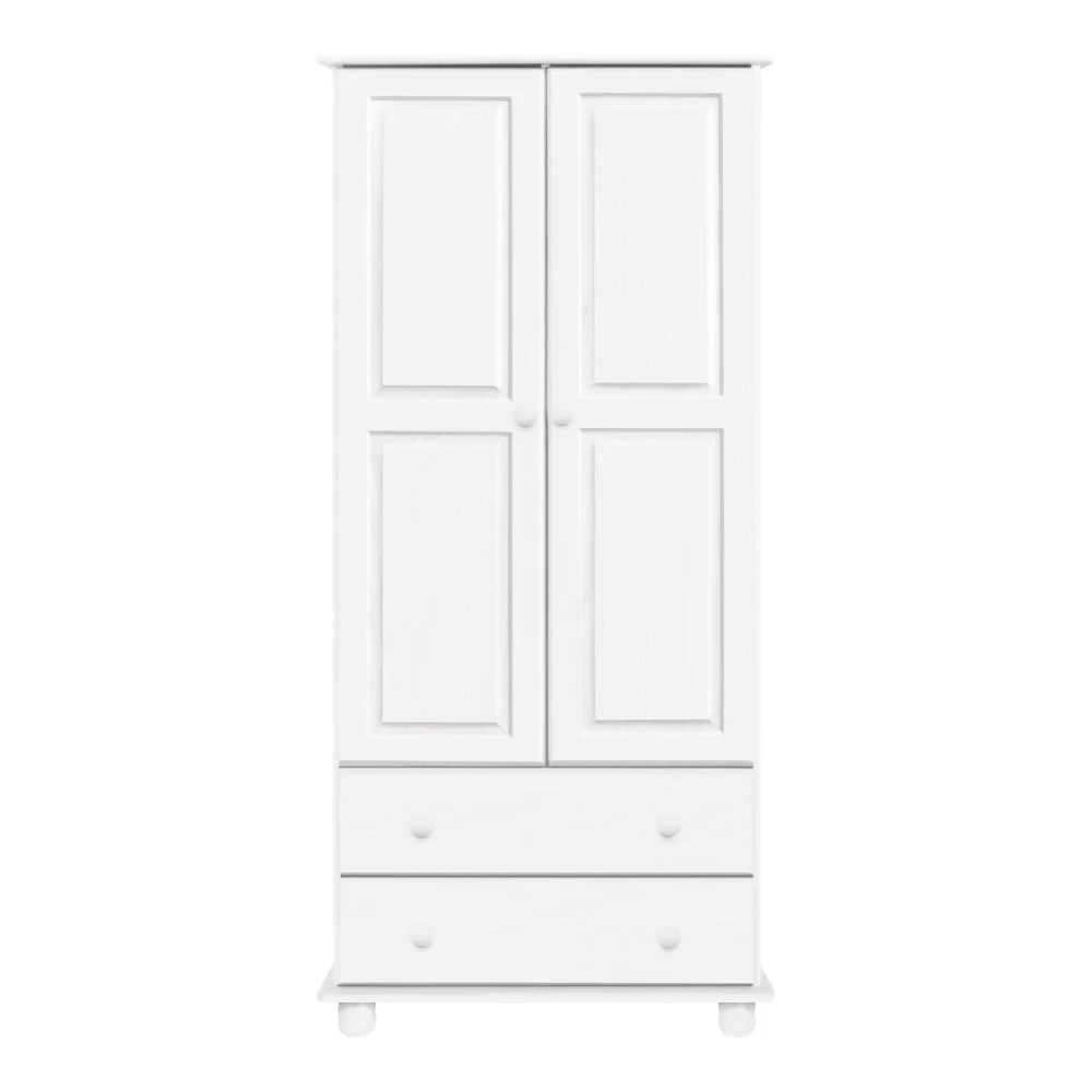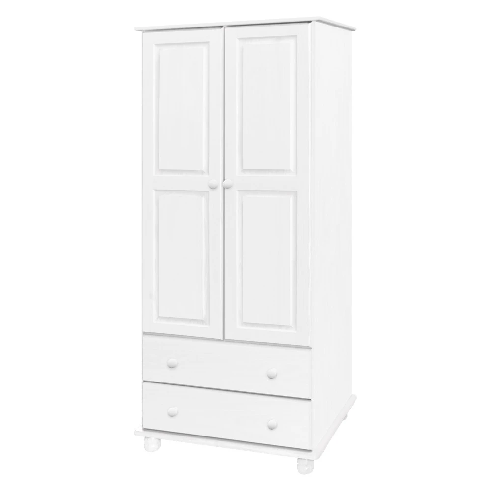 materiál masiv borovice, barevné provedení bílý lak dvě široké zásuvky s kovovými pojezdy v horní části šatní tyč a 3 police doporučený nástavec 8861B